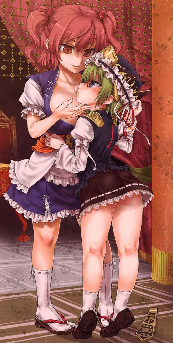 2girlsblue eyesblushbreastsgreen hairhair bobbleshair ornamenthathuge breastskneepitslegsmultiple girlspetitered eyesribbonshort hairtabitwintailsyuri