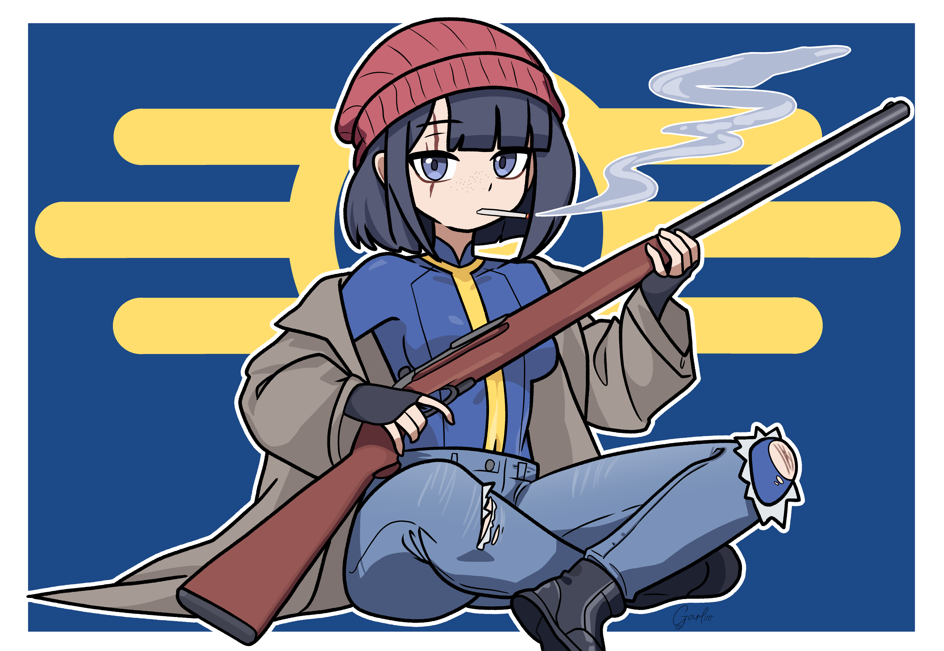 1girlartist nameblack bootsblack hairblue bodysuitblue eyesbodysuitbootsbreastsclosed mouthcoatdenimfrecklesgunhigh collarholdingholding gunholding weaponjeanslooking at viewerpantsriflescarscar across eyescar on faceshort hairsittingsmokingsolotorn clothestorn jeanstorn pantstrench coatvault suitweapon