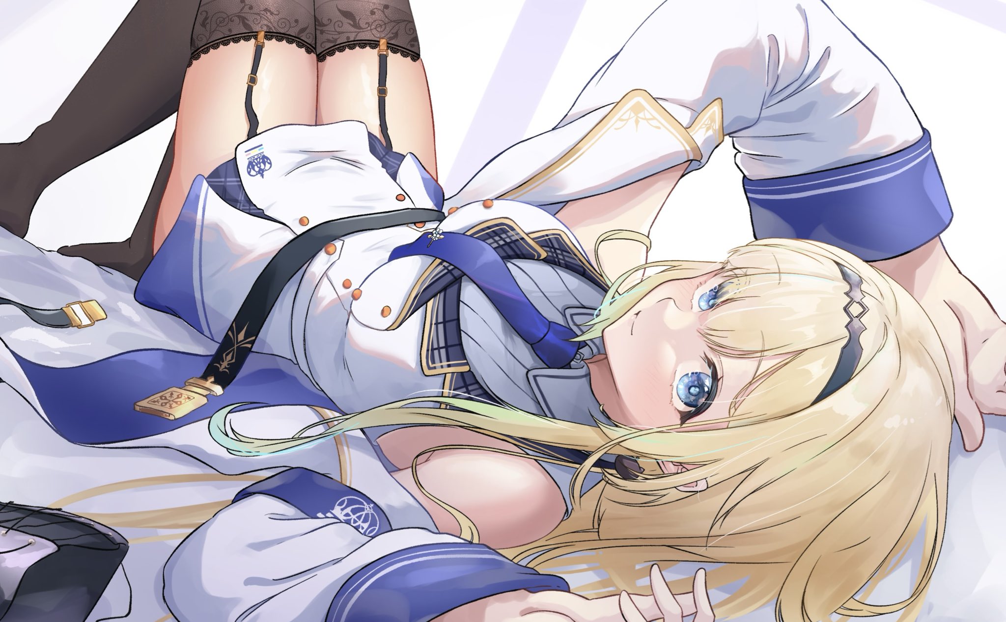 huanyi huanhuanzi, shorekeeper (wuthering waves), wuthering waves, absurdres, chinese commentary, commentary request, highres, 1girl, alternate costume, artist name, blue hair, breasts, closed mouth, colored eyelashes, cowboy shot, grey sailor collar, grey skirt, hand up, large breasts, light blush, long hair, looking at viewer, midriff peek, neckerchief, purple eyes, red neckerchief, red pupils, sailor collar, school uniform, serafuku, shirt, simple background, skirt, solo, twirling hair, white background, white shirt