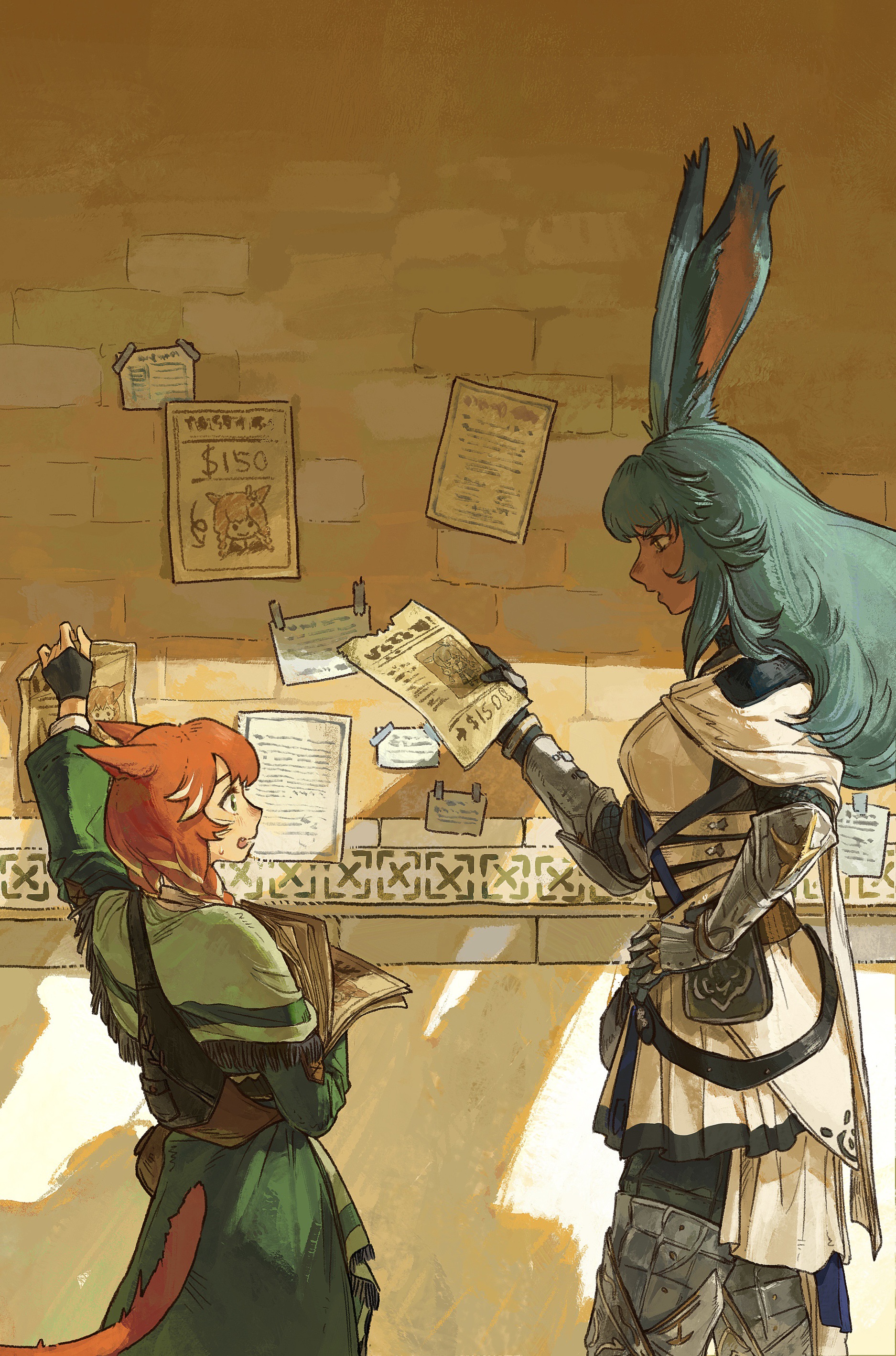 2girlsanimal earsaqua hairarm upblack glovesbraidbrick wallcat girlcat tailcloakfingerless glovesfrom sidegauntletsgloveshand on own hiplooking at anothermiqo'temulticolored hairmultiple girlsorange hairrabbit earsstreaked hairsweattailvierawhite cloakwhite streaks
