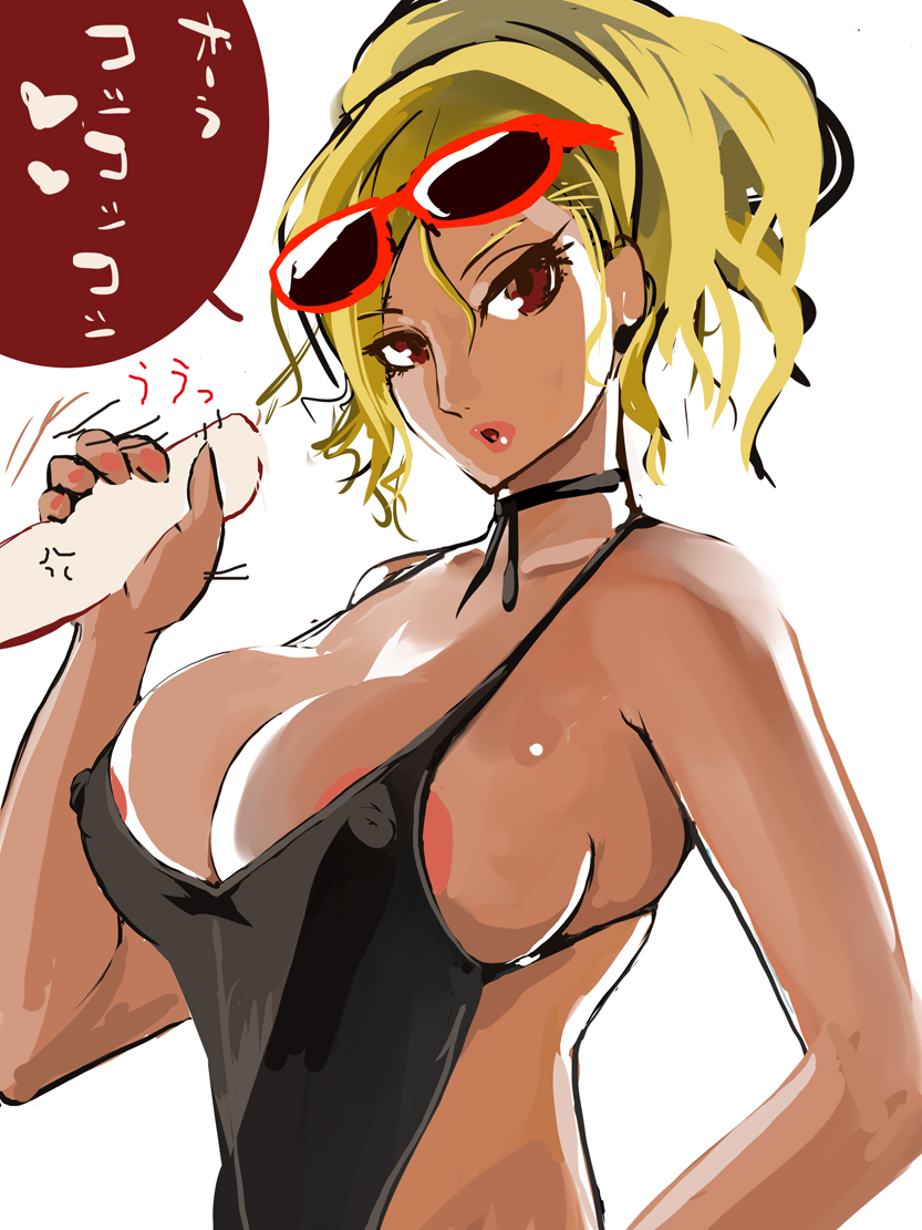 1boy1girlsblonde hairbreastsbrown eyeschokercleavagedark skinfemaleFlag for Deletionhandjobholdinghumanlipslooking at viewermalenail polishneck ribbonnipplesopen mouthpenisponytailribbonstraightsunglassessunglasses on headtied hair