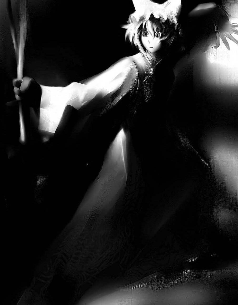 1girlanimal hatfemale focusgreyscalehatlong sleevesmob capmonochromeshort hairsolowide sleeves