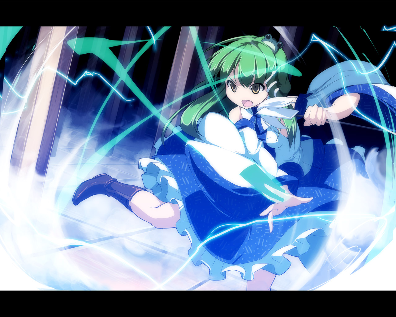 :o1girlblue skirtdetached sleevesfemale focusgreen eyesgreen hairletterboxedlong sleevesmagicmatching hair/eyesnontraditional mikoopen mouthpillarskirtsolostandingvest