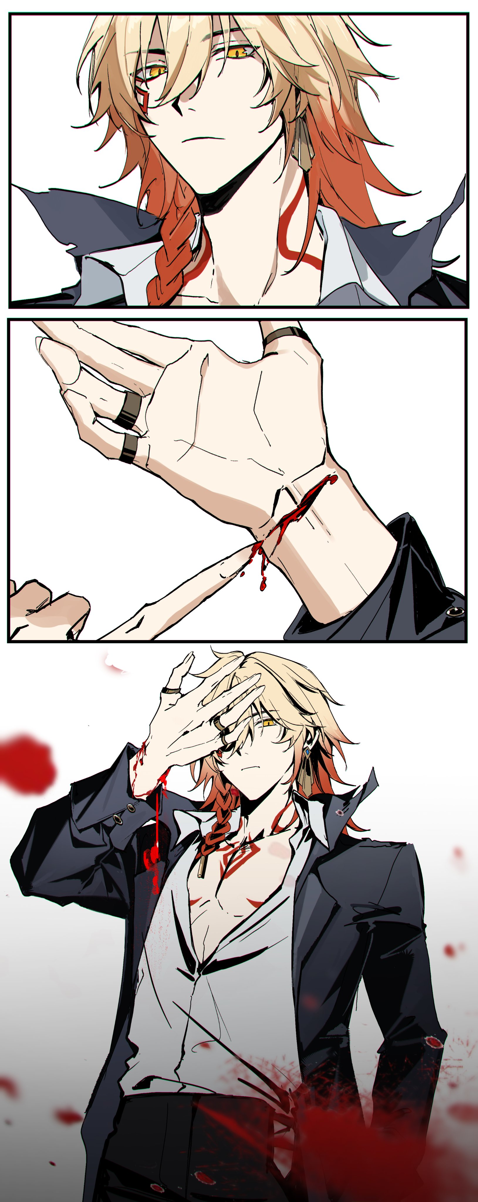 1boyblack jacketblack pantsblonde hairbloodblood dripbraidchest tattoocollared shirtearringsfacial tattoogold earringsgradient hairjacketjewelrymale focusmedium hairmulticolored hairopen clothesopen jacketpantspartially unbuttonedpectoral cleavagepectoralsred hairred tattooself-harmshirtshirt tucked inside braidsolotattoowhite shirtyellow eyes