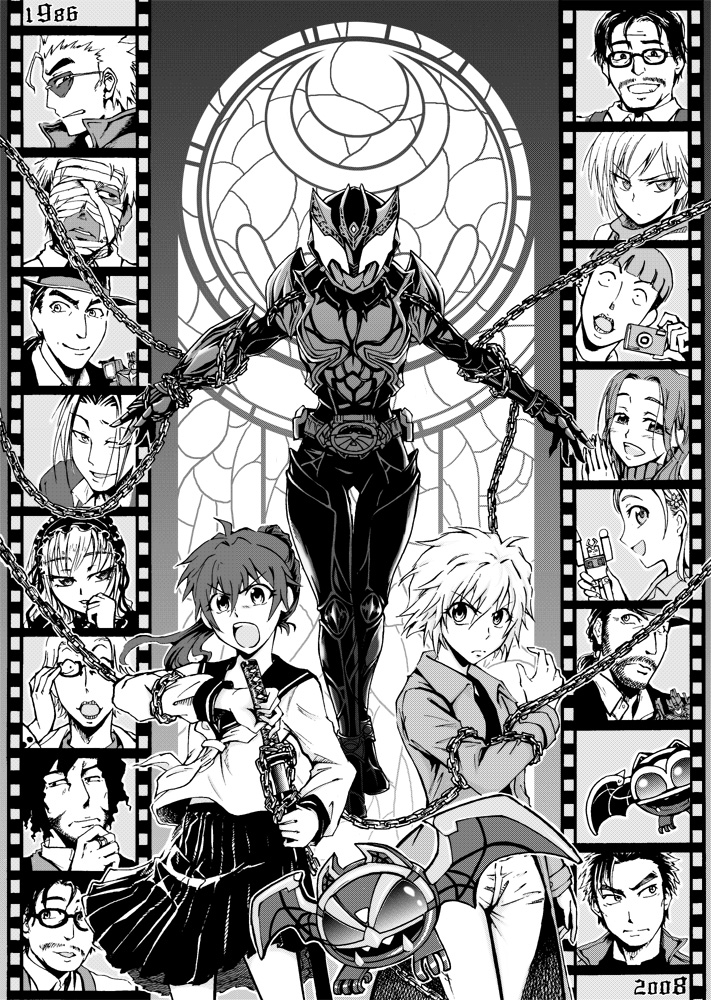 6+boys6+girlsaso megumichaingreyscalemonochromemultiple boysmultiple girlsschool uniformstained glassswordweapon