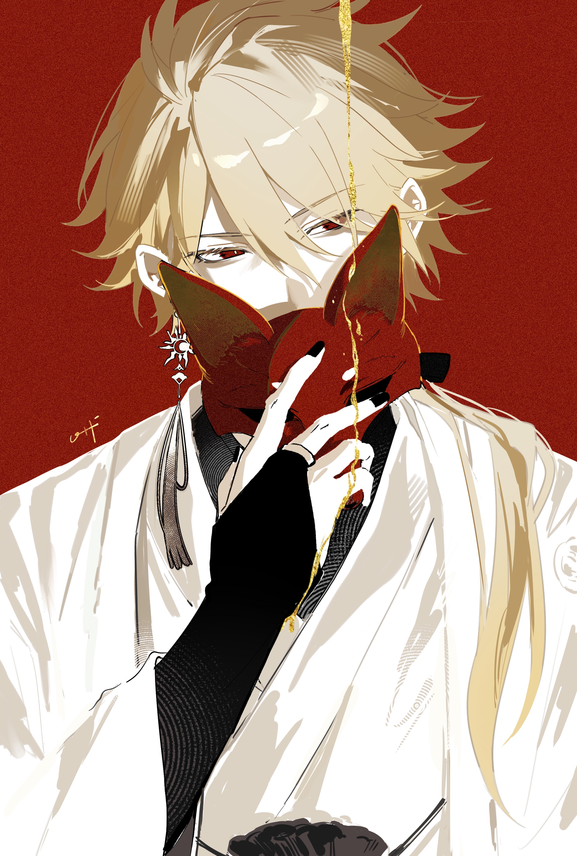 1boyalternate formblack bridal gauntletsblonde hairbloodblood dripbridal gauntletscosplayearringsfox maskfox mask (silent hill) (cosplay)half maskholdingholding maskjapanese clothesjewelrykimonomale focusmaskred backgroundred eyessimple backgroundsingle earringsolotasseltassel earringswhite kimonoyellow blood