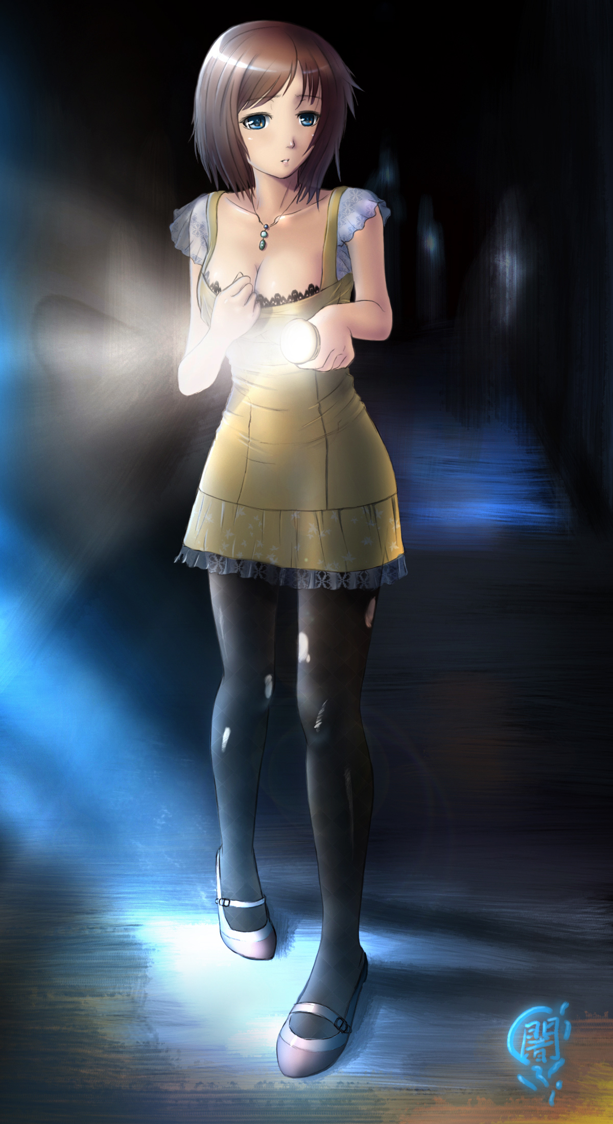 1girlbreastsfemale focusflashlightlarge breastspantyhoseshort hairsolotorn clothestorn pantyhose