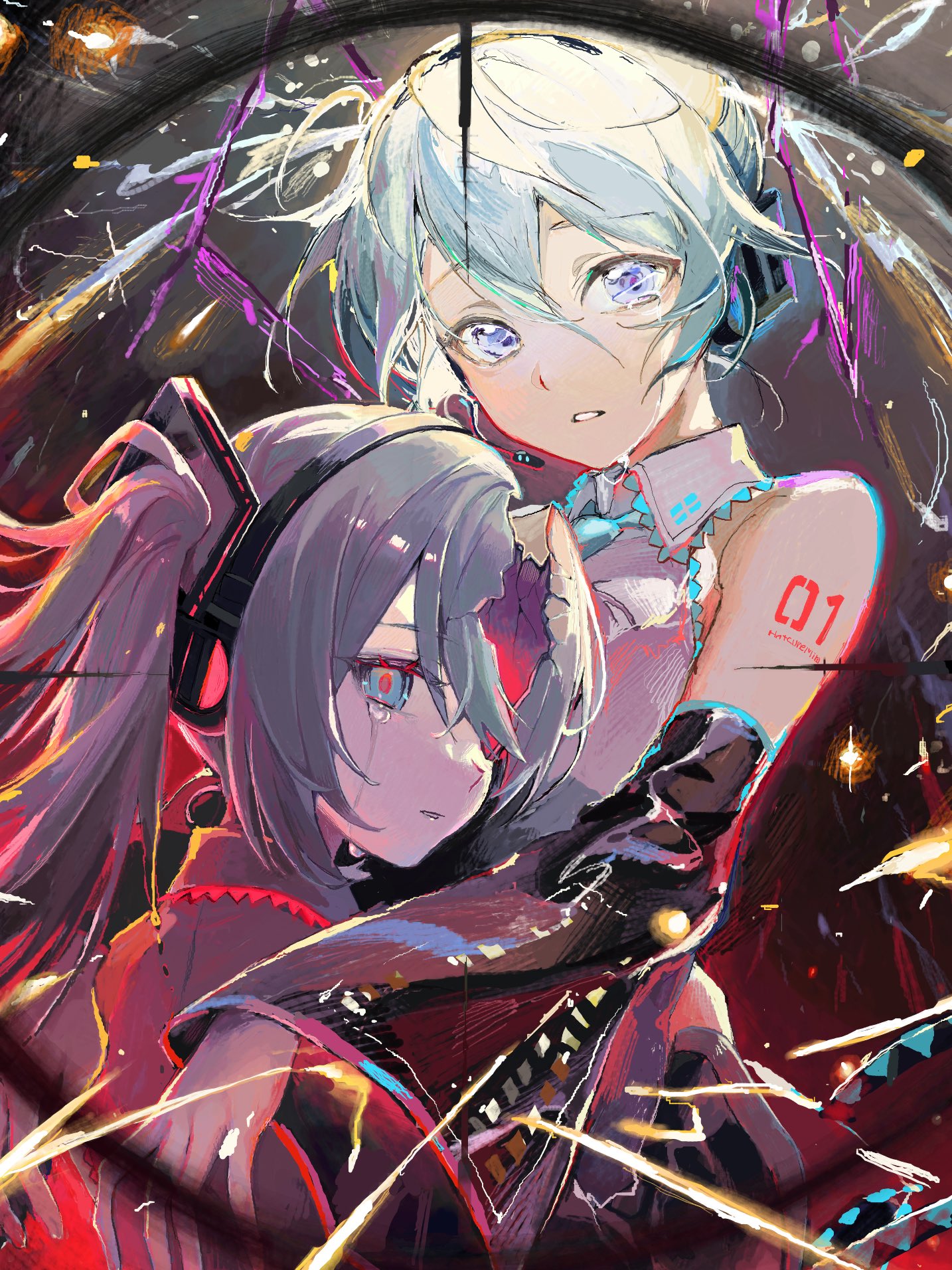 2girlsaqua eyesaqua hairaqua necktieaqua trimbare shouldersblack skirtblack sleevescollared shirtcryingcrying with eyes opendetached sleevesdouble-parted bangsdual personagrey shirthair between eyesheadsetmarshmallow (vocaloid)multiple girlsnecktienumber tattoopurple eyesred pupilsshirtshoulder tattoosightingskirtsleevelesssleeveless shirttattootearstwintails