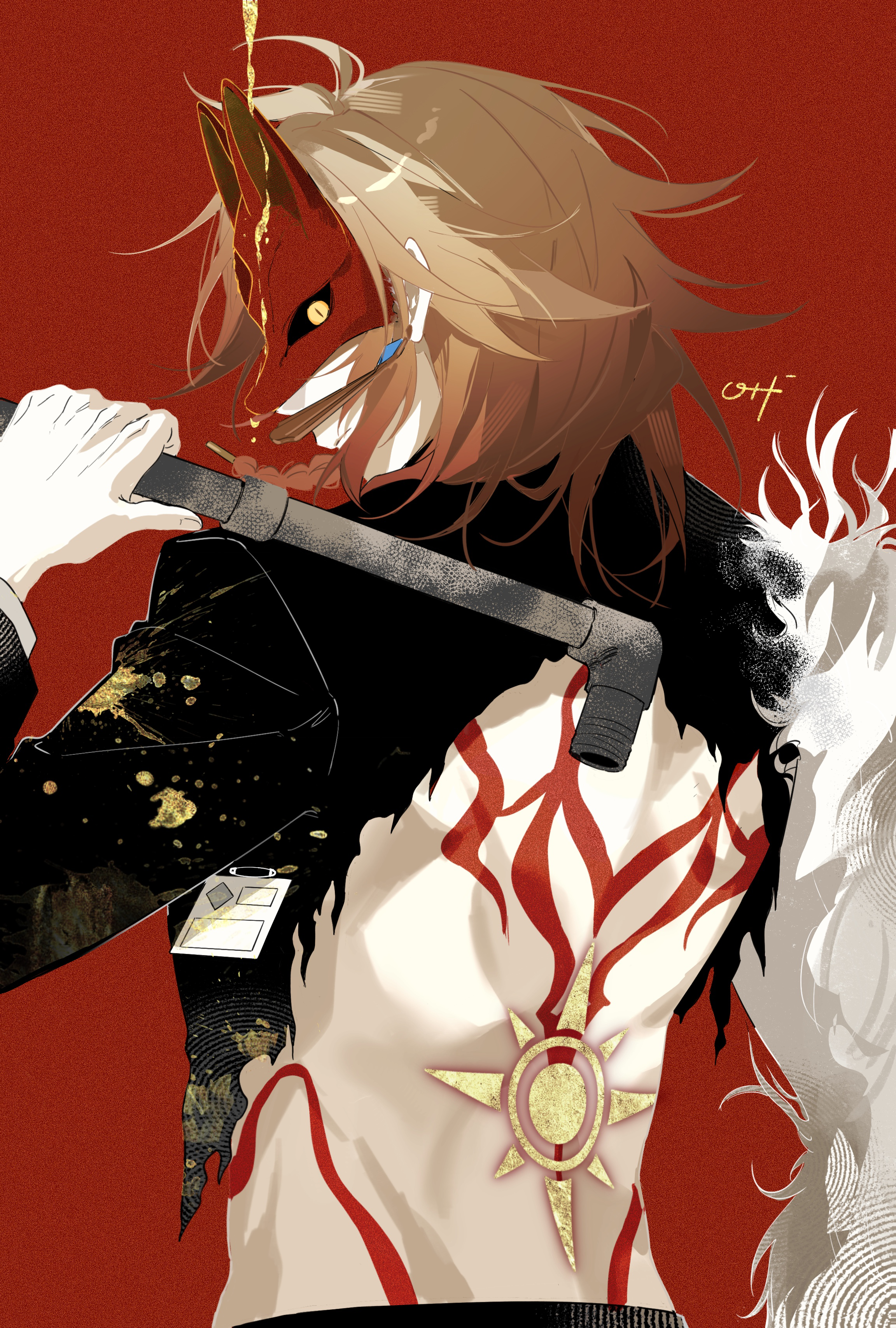 1boyback tattooblack jacketblonde hairbloodblood dripblood on clothesbraidearringsfox maskgradient hairhalf maskholdingholding lead pipejacketjewelrylead pipemale focusmaskmedium hairmulticolored hairred backgroundred hairred tattooside braidsimple backgroundsolosun symbolsun tattootantattootorn clothestorn jacketyellow blood