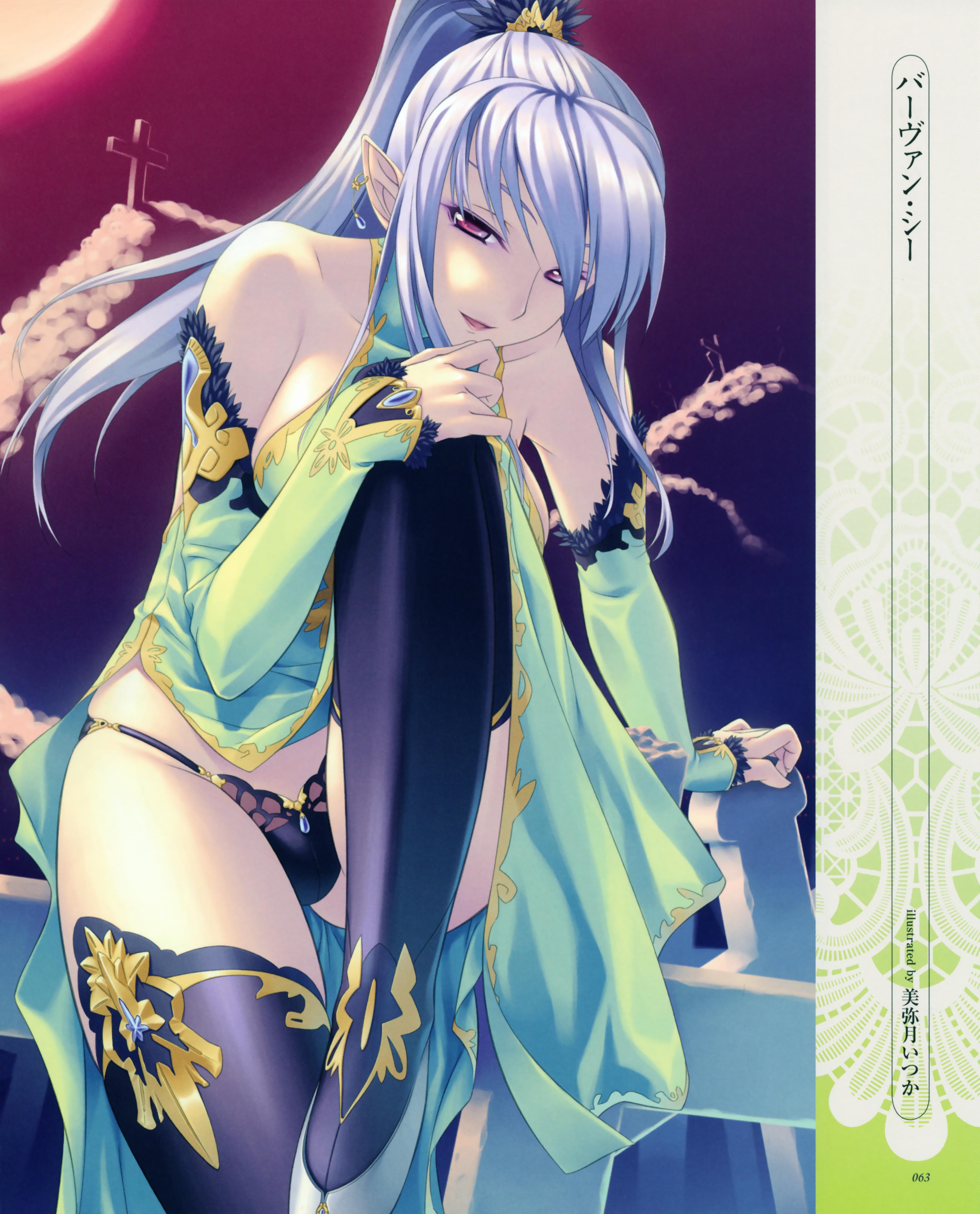 1girlbare shouldersblue hairdetached sleevesdressfemale focuslong hairpantiespink eyespointy earsponytailpurple hairred eyessolothighhighsunderwear
