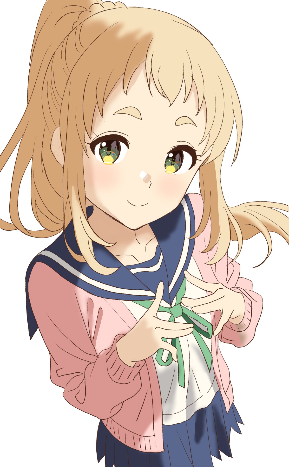 1girlblonde hairblue sailor collarblue skirtblushclosed mouthcollarbonedot nosefeet out of framefemale focusgreen eyeslong sleeveslooking at vieweropen clothesopen sweaterpink sweaterponytailribbonsailor collarschool uniformserafukushirtsimple backgroundskirtsmilesolostandingsweaterwhite backgroundwhite shirt