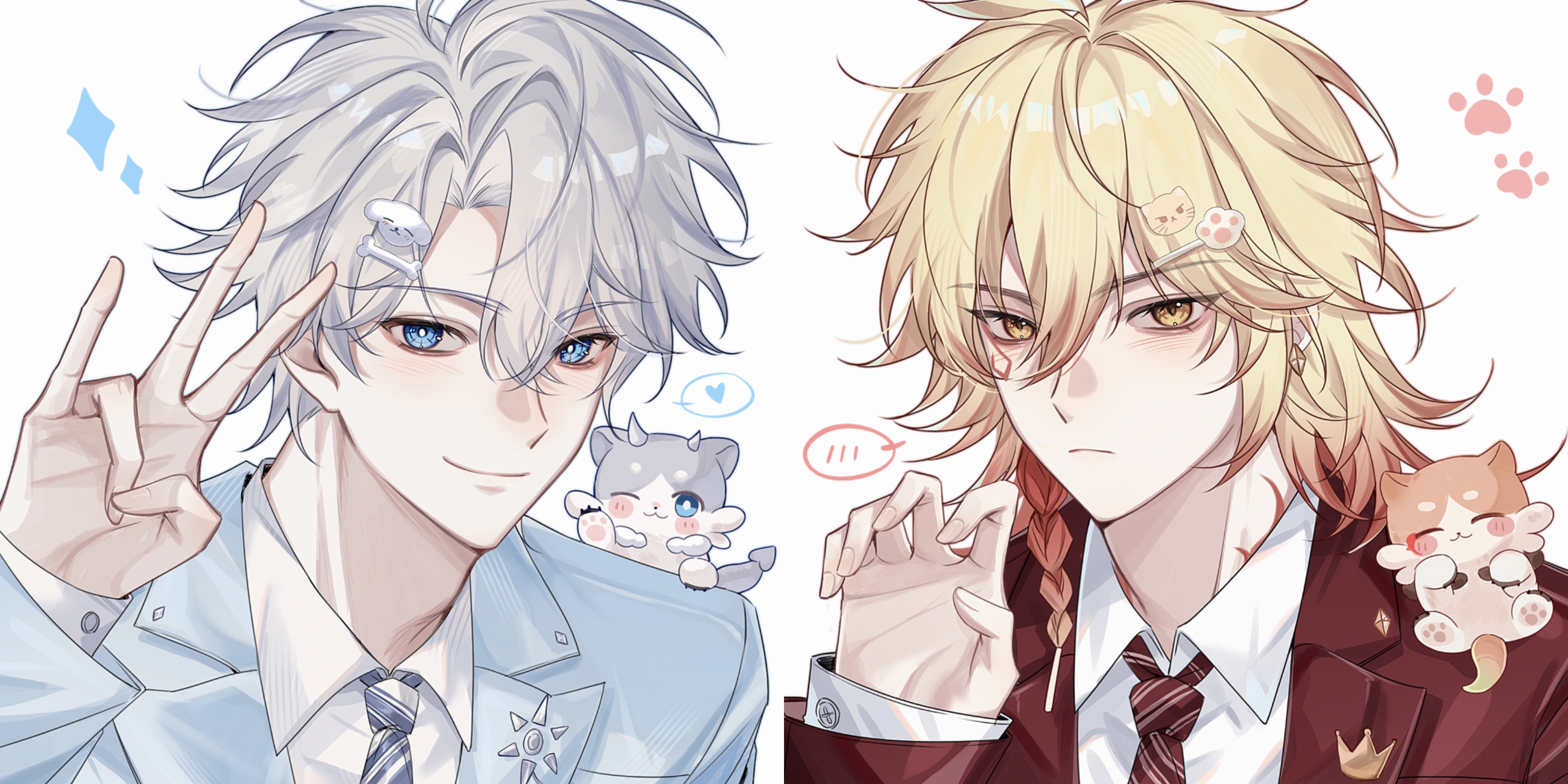 2boysantenna hairblonde hairblue eyesblue jacketblushbraidchimera (honkai: star rail)collared shirtdayang36651facial tattoogradient hairhair ornamenthairpinheartjacketlayered sleeveslooking at viewermale focusmedium hairmulticolored hairmultiple boysneck tattoonecktieparted bangsred hairred jacketred necktiered tattooshirtshort hairside braidsimple backgroundspoken blushspoken hearttattoowhite backgroundwhite hairwhite shirtyellow eyes