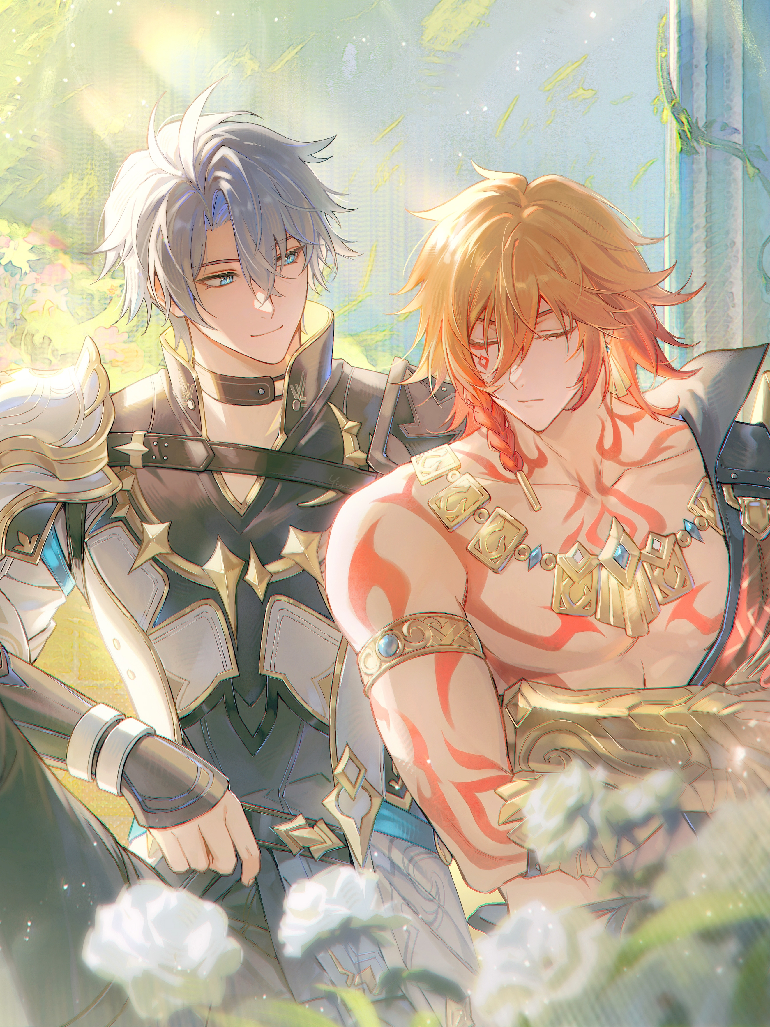 estelle bright, joshua bright, eiyuu densetsu, sora no kiseki, absurdres, highres, 1boy, 1girl, ahoge, armor, black gloves, blue sky, brown gloves, closed mouth, cloud, cropped jacket, double-parted bangs, fingerless gloves, floating hair, gloves, hair between eyes, hair intakes, harmonica, holding, holding instrument, instrument, light rays, long hair, open mouth, parted bangs, pauldrons, red eyes, short sleeves, shoulder armor, sidelocks, single pauldron, sky, smile, sunbeam, sunlight, takuno y, twintails, yellow eyes
