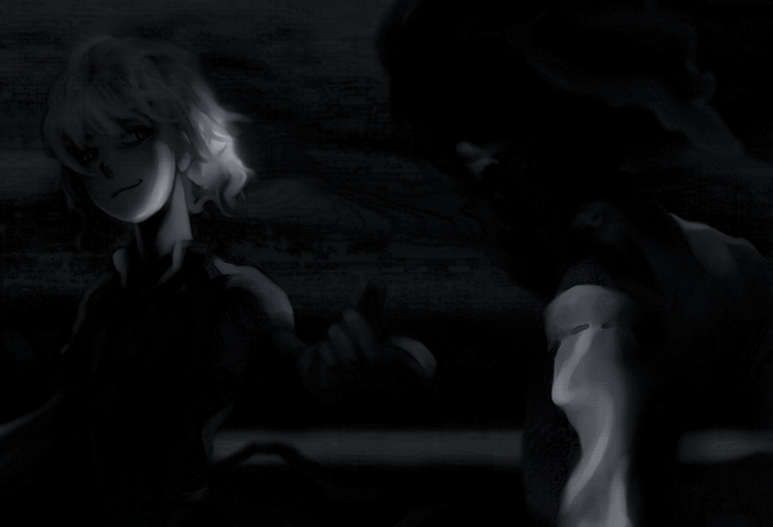 2girlsdarkevil smilefemale focusgreyscalehead tiltlong hairlooking at viewermonochromemultiple girlsshort hairsmileupper body