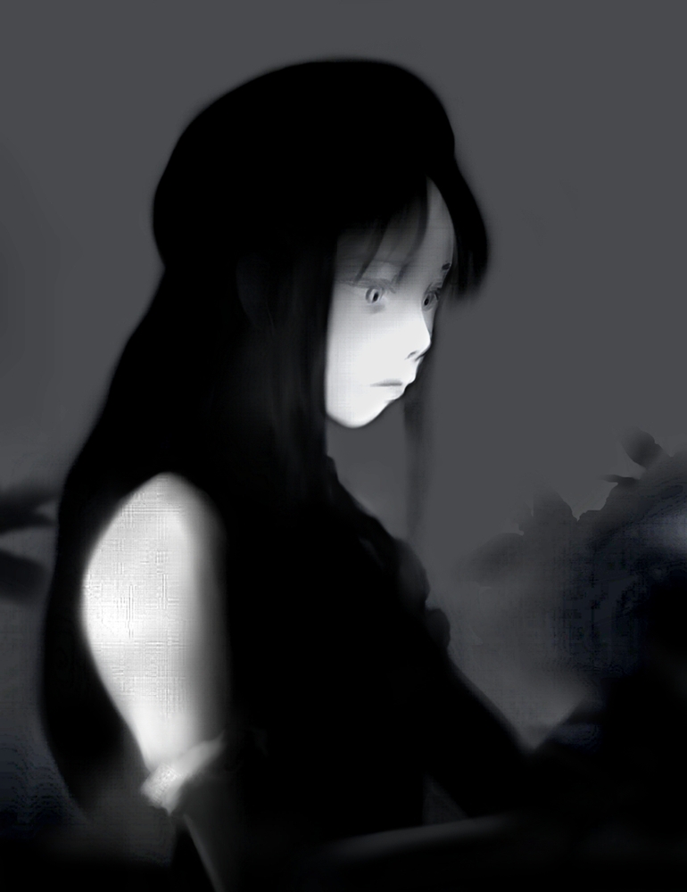 1girlbare shouldersdetached sleevesfemale focusgrey backgroundgreyscalehatlooking downmonochromesimple backgroundsolo