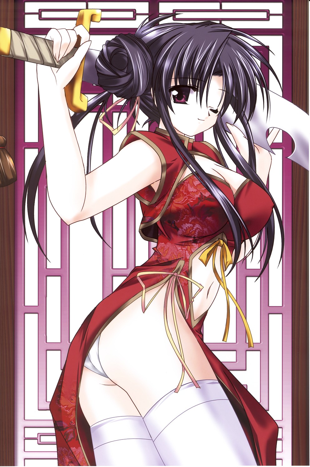 1girlalternate costumealternate hairstylebreastschina dresschinese clothescleavagecleavage cutoutclothing cutoutcowboy shotdao (weapon)dressfemale focusholdingholding swordholding weaponnavelone eye closedpantiespurple eyespurple hairribbonsoloswordthighhighsunderwearweaponwhite thighhighswink