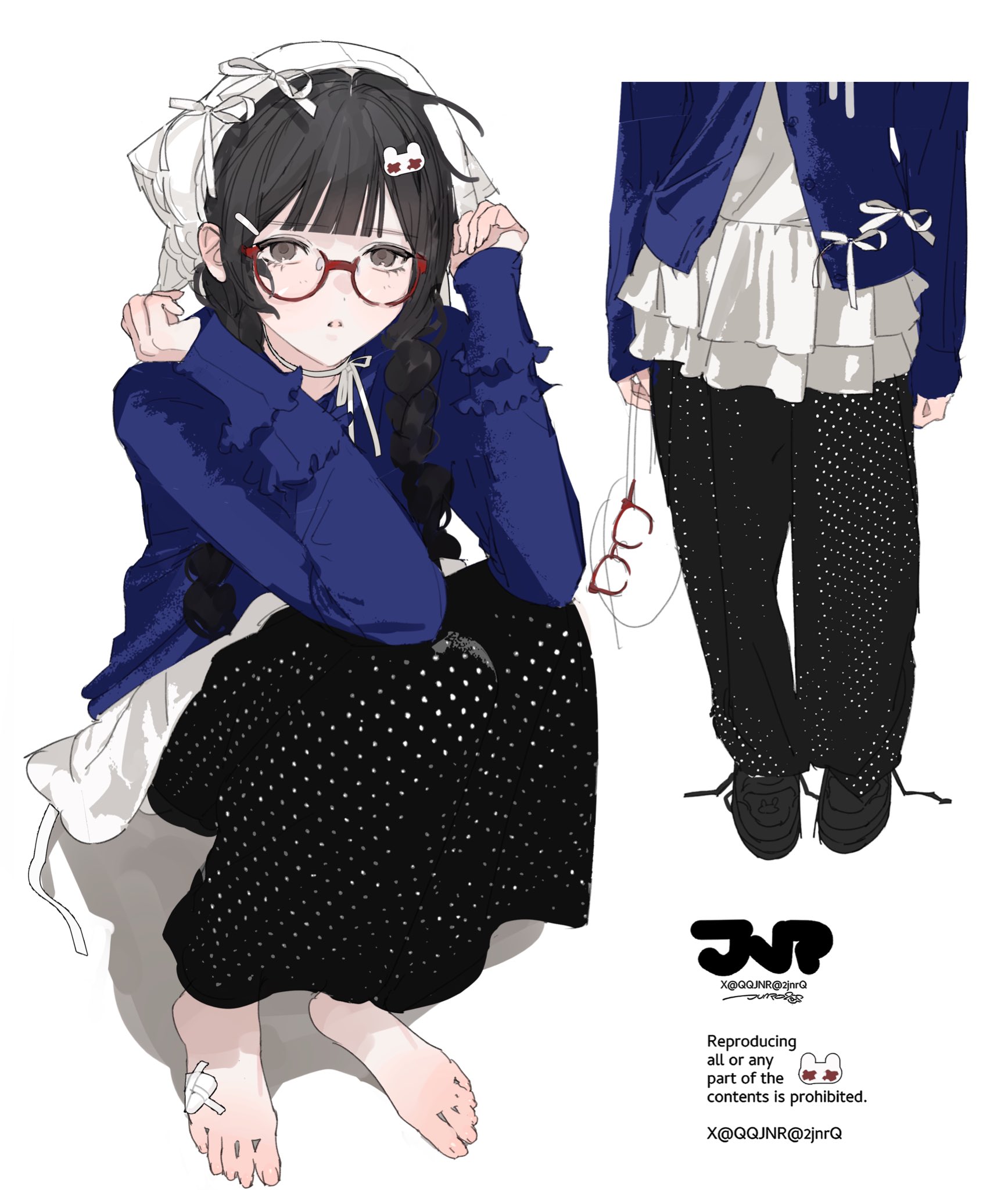 1girlartist namebarefootbear hair ornamentblack pantsblack shoesblue cardiganblunt bangsbraidcardiganchokerdresselbows on kneesfashionfeetfrilled dressfrilled sleevesfrillsfull bodyglasseshair ornamenthatinjurylong hairlong sleeveslooking at viewerlower bodymultiple viewsopen mouthpantspants under dresspolka dot pantsred-framed eyewearribbonribbon chokershirt ribbonshoessignaturesimple backgroundsittingsneakersstreetweartwin braidstwitter usernamewhite backgroundwhite dress