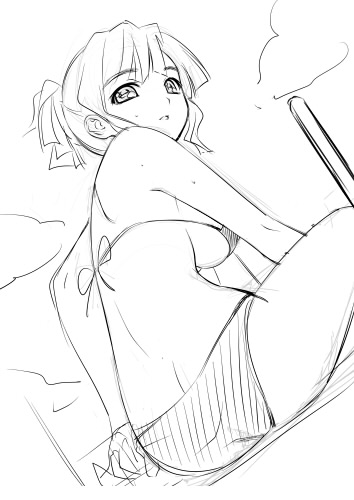 1girlbikinibreastsbutt crackfemale focusfrom behindgreyscalelarge breastslooking backmonochromeponytailsittingsketchsoloswimsuitunderboob