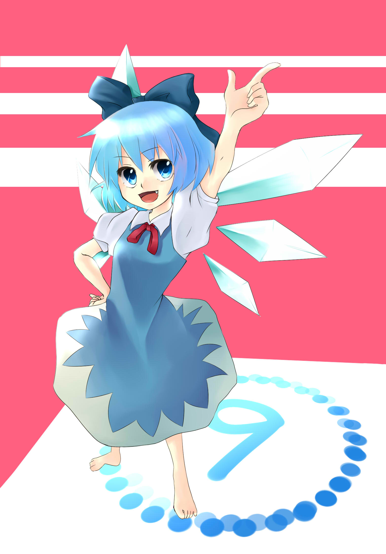 1girlbarefootblue eyesblue haircircled 9dressfemale focusfull bodymatching hair/eyesopen mouthribbonshort hairsolowings