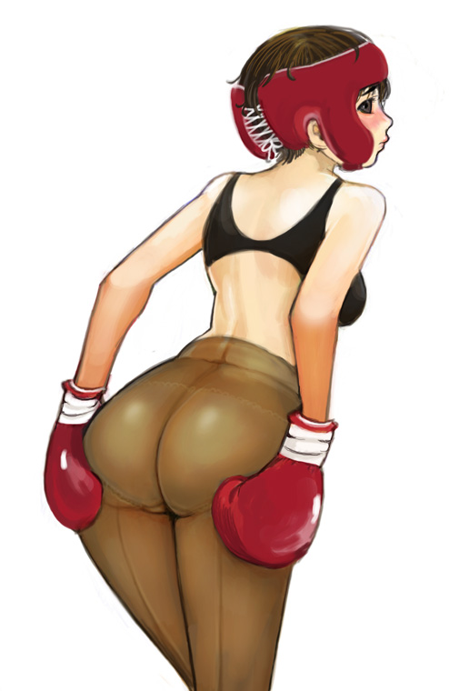1girlassback-seamed legwearblushboxingboxing glovesboxing headgearbrown eyesbrown haircrotch seamfemale focusfrom behindgrabbing own asslooking backpantiespanties under pantyhosepantyhoseseamed legwearsee-through clothessimple backgroundsolosports braunderwearunderwear only