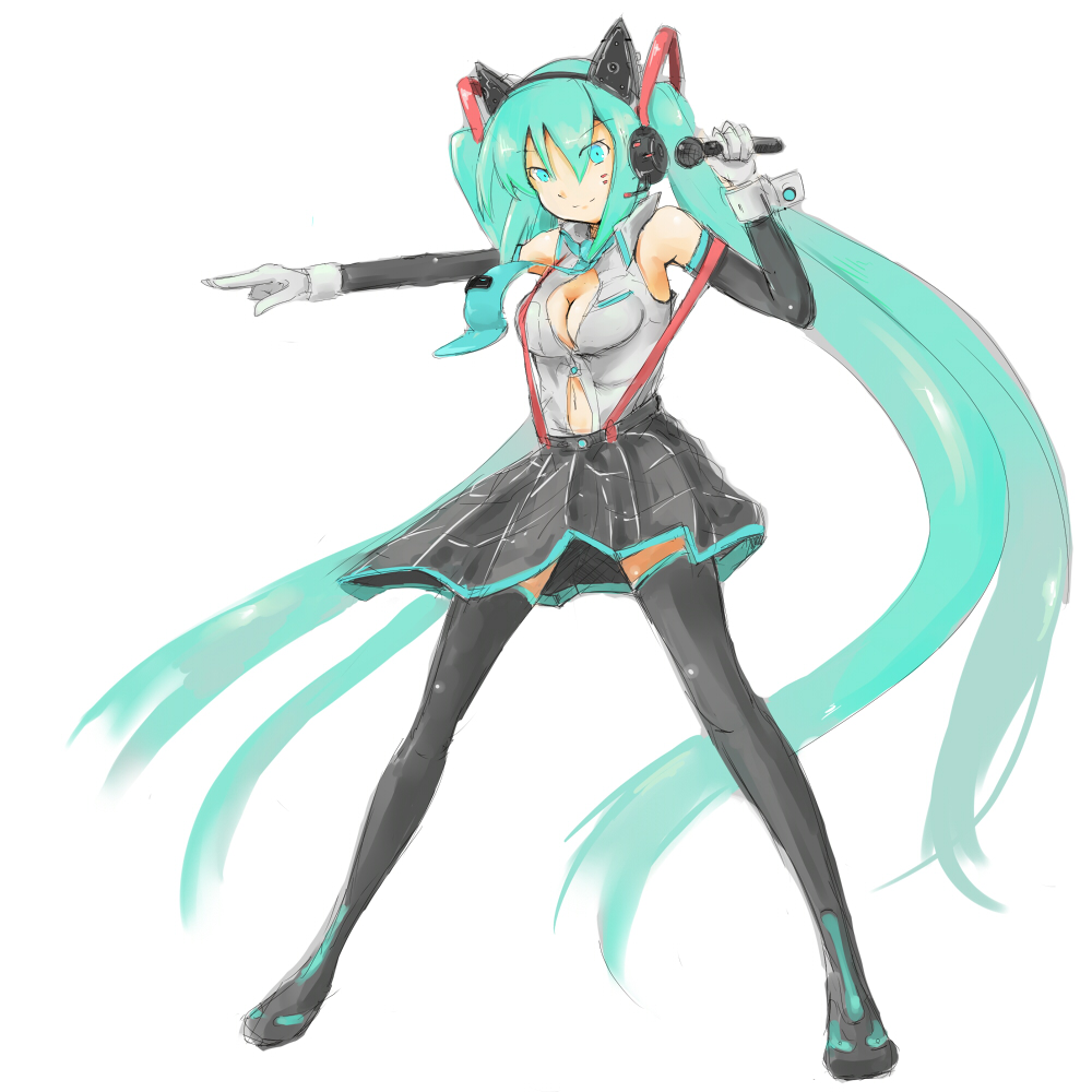 1girlaqua eyesaqua hairbreastscleavageelbow glovesfemale focusglovesheadsetlong hairmedium breastsmicrophonenavelnecktieskirtsolosuspendersthighhighstwintailsvery long hair