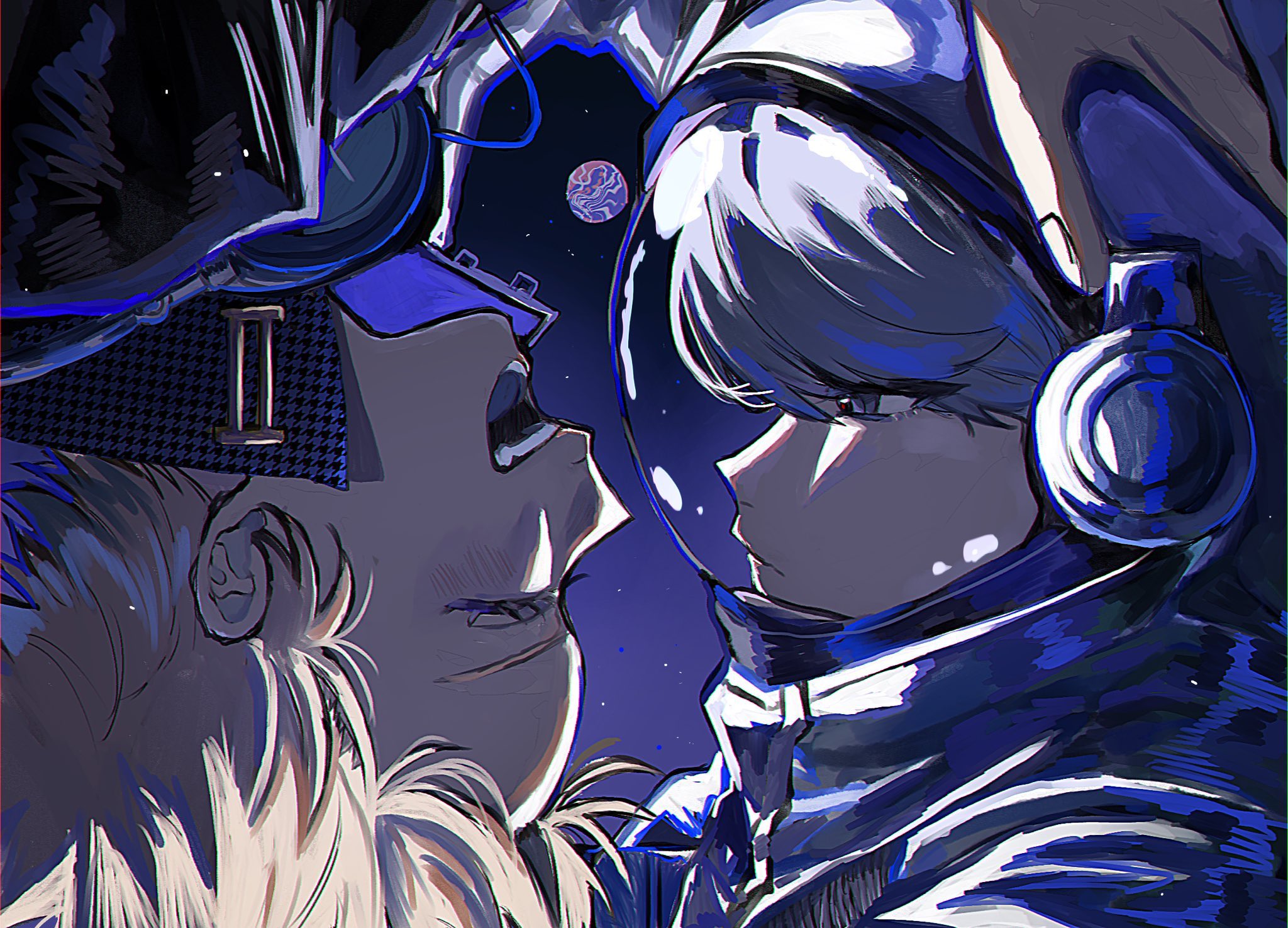 :d2boysastronautblack jacketblonde hairblushbodysuitclosed mouthearth (planet)grey eyesgrey hairhand on another's headhelmetjacketlooking at anothermale focusmultiple boysneruyokuopen mouthplanetportraitrotational symmetryschool uniformsmilespacespace helmetstar (sky)upside-downwhite bodysuityasogami school uniform