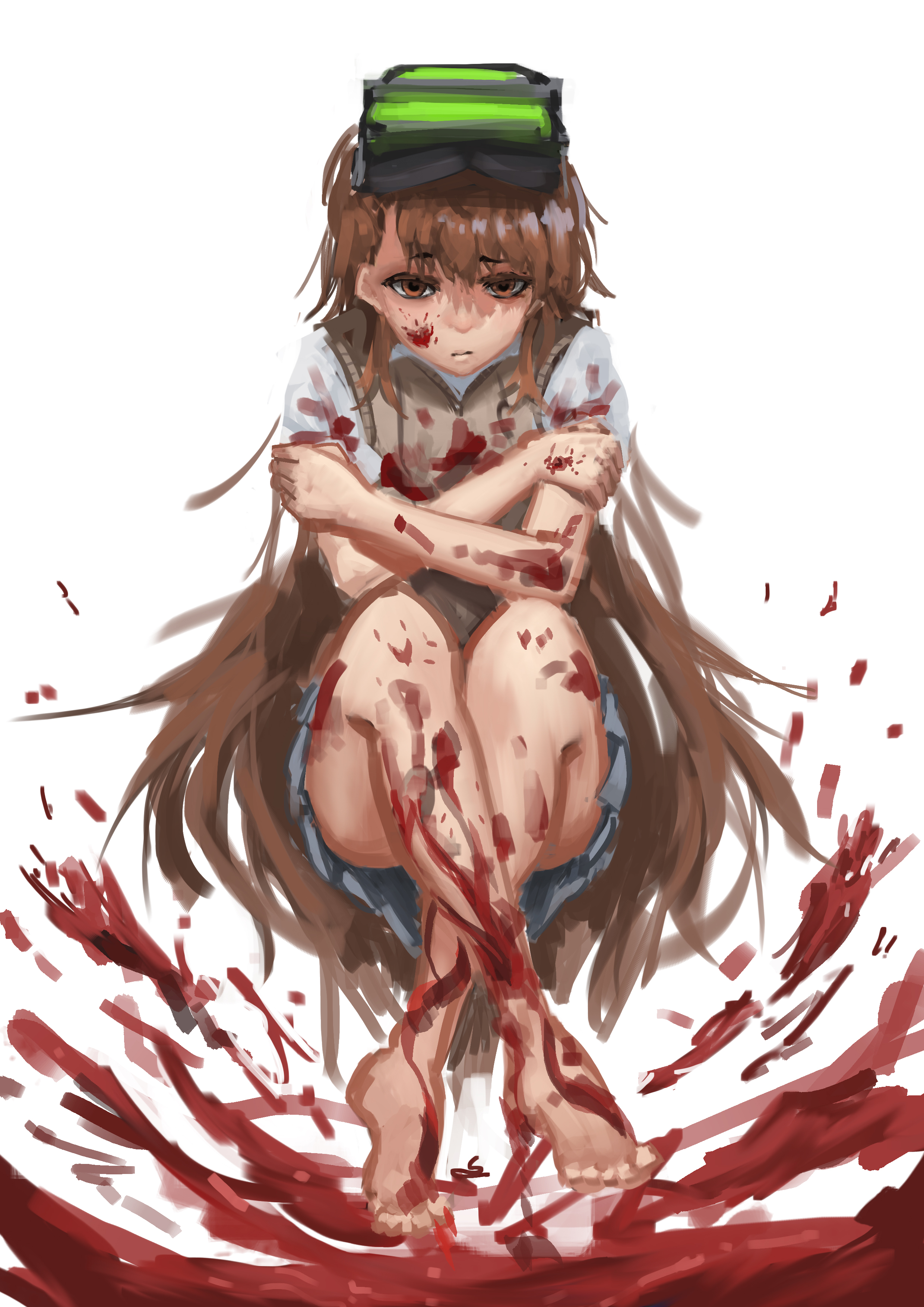 1girlasymmetrical bangsbare armsbare legsbarefootbloodblood on armblood on clothesblood on faceblood on feetblood on handsblood on legbrown eyesbrown hairbrown sweaterbrown sweater vestbrown vestclosed moutheyewear on headgogglesgoggles on headgrey skirtlong hairminiskirtnight vision devicepleated skirtschool uniformself hugshaded faceshirtshort sleevesskirtsleevelesssleeveless sweatersolosummer uniformsweatersweater vesttokiwadai school uniformvery long hairvestwhite backgroundwhite shirt