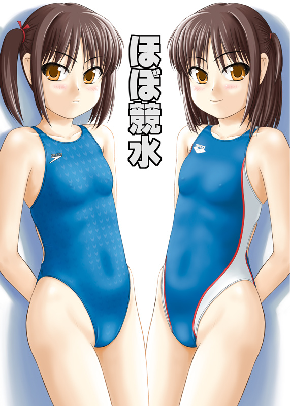 2girlsbrown haircompetition swimsuitcovered erect nipplesflat chestmultiple girlsone-piece swimsuitorange eyesshort hairswimsuit