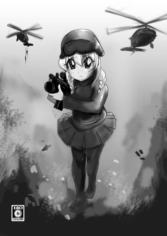 00s1girlaircraftbraidfemale focusgogglesgreyscalegunhelicopterhelmetmilitarymilitary uniformmonochromepantyhosesolotwin braidsweapon