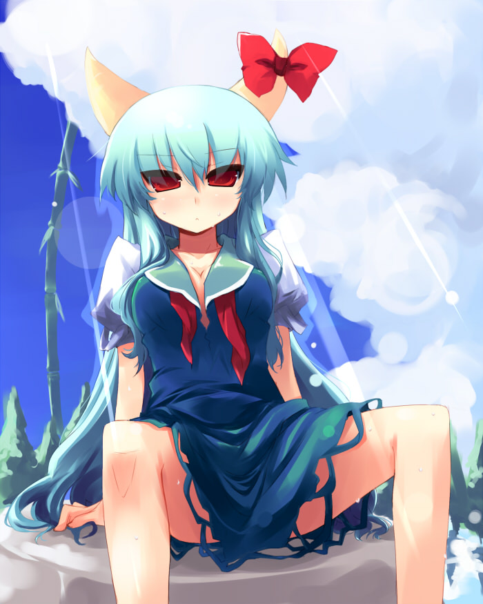 1girlblue hairbreastscleavageclouddayfemale focushornslarge breastslight rayslong hairred eyesribbonsittingsolospread legssunbeamsunlightwet