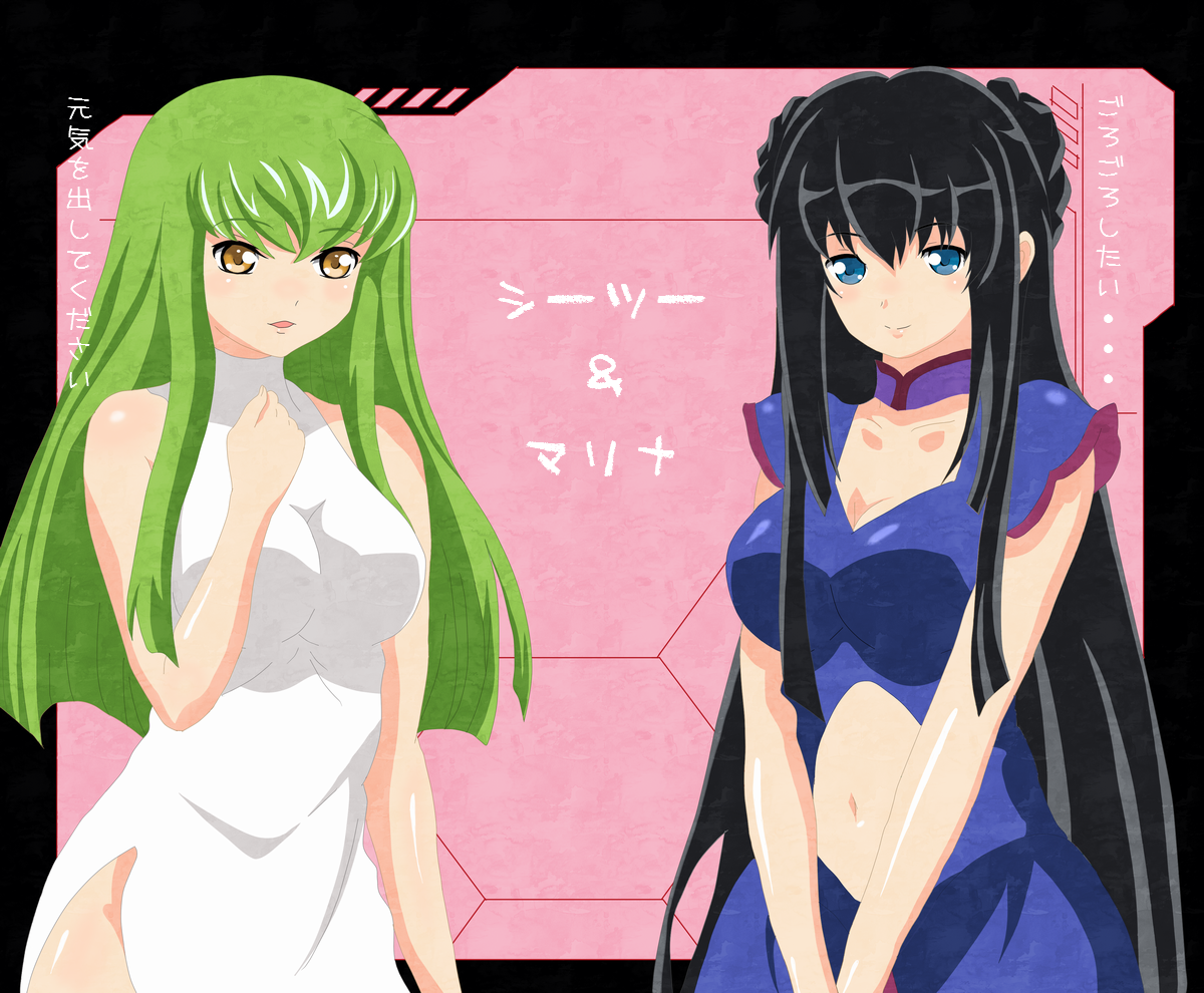 shizuma yoshinori, etou kanami, juujou hiyori, toji no miko, absurdres, alt text, commentary request, highres, official art, 2girls, bird, black hair, blunt bangs, brown eyes, brown hair, cherry blossoms, cherry tree, closed mouth, crow, dress, full body, geta, green dress, hair between eyes, hat, hime cut, holding, holding sword, holding weapon, katana, long hair, looking at viewer, multiple girls, official alternate costume, sheath, short hair, simple background, smile, sparrow, sword, tengu-geta, tree, unsheathing, weapon, white background, white dress, wrist guards