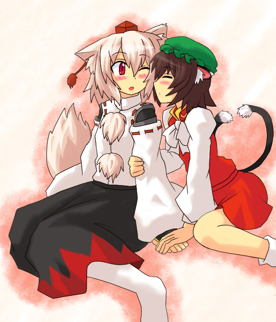 2girlsanimal earsblushcat earscat girlcat tailclosed eyesfemale focushatmultiple girlstailtokin hatwinkwolf earswolf tail