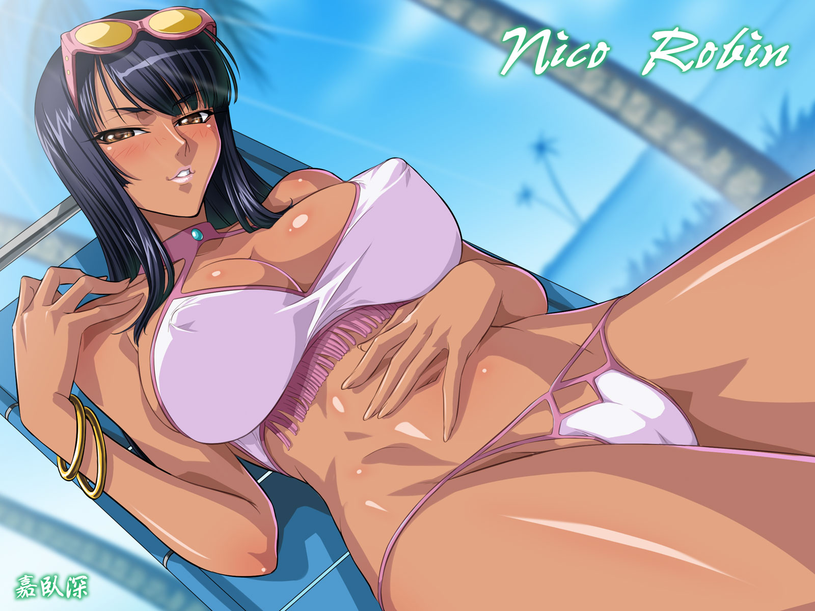 1girlbare shouldersbikiniblushbraceletbreastschaircharacter namecleavagecovered erect nipplesdark skindark-skinned femaledaydutch angleeyewear on headfemale focusjewelrylarge breastslipsticklong hairlooking at viewerlounge chairmakeupnavelpalm treeparted lipsshiny skinsittingsolosunglassesswimsuittree