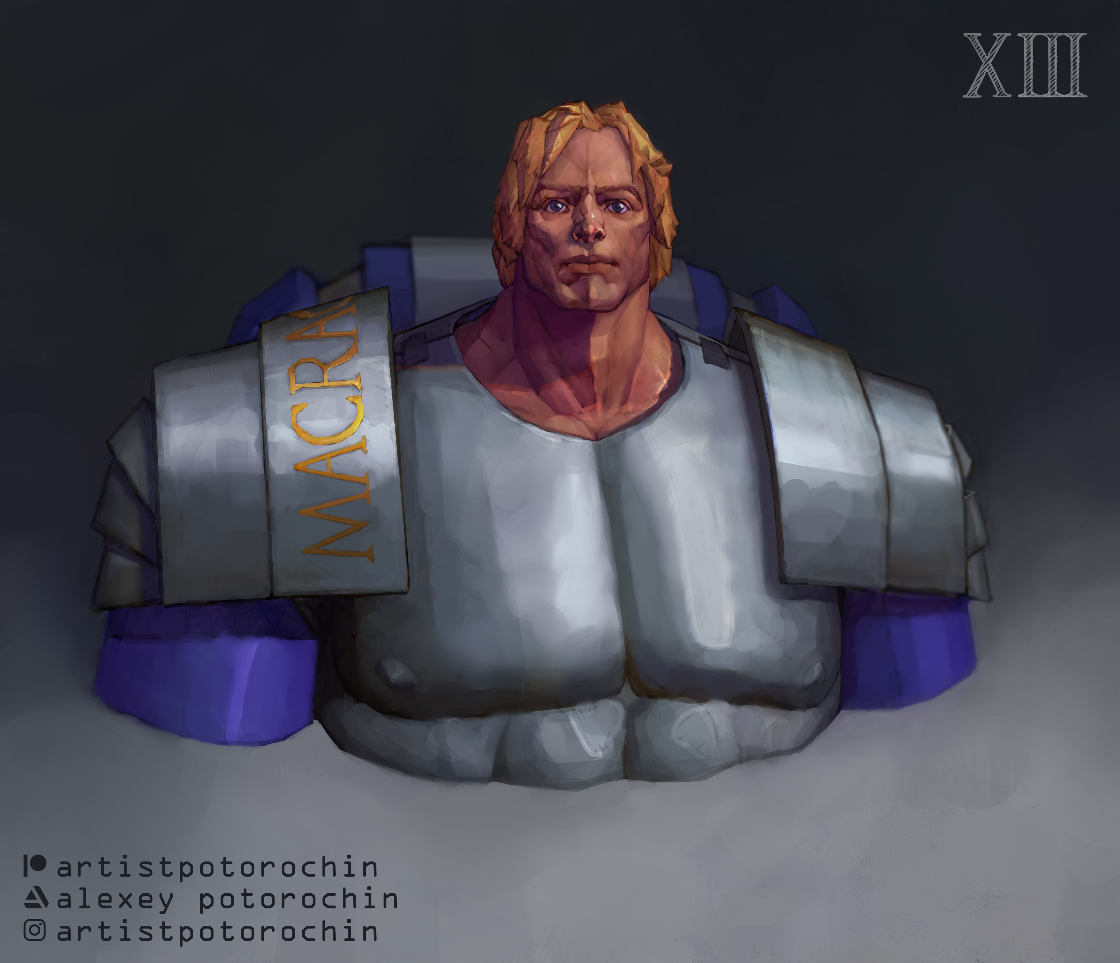 1boyarmorartist nameartstation logoartstation usernameblonde hairblue eyesbreastplateclosed mouthcovered pectoralsenglish textgrey armorgrey backgroundinstagram logoinstagram usernamelarge pectoralslooking at viewermuscularmuscular malenipplespatreon logopatreon usernamepauldronspectoralspower armorprimarchroman numeralshort hairshoulder armorsimple backgroundsolo