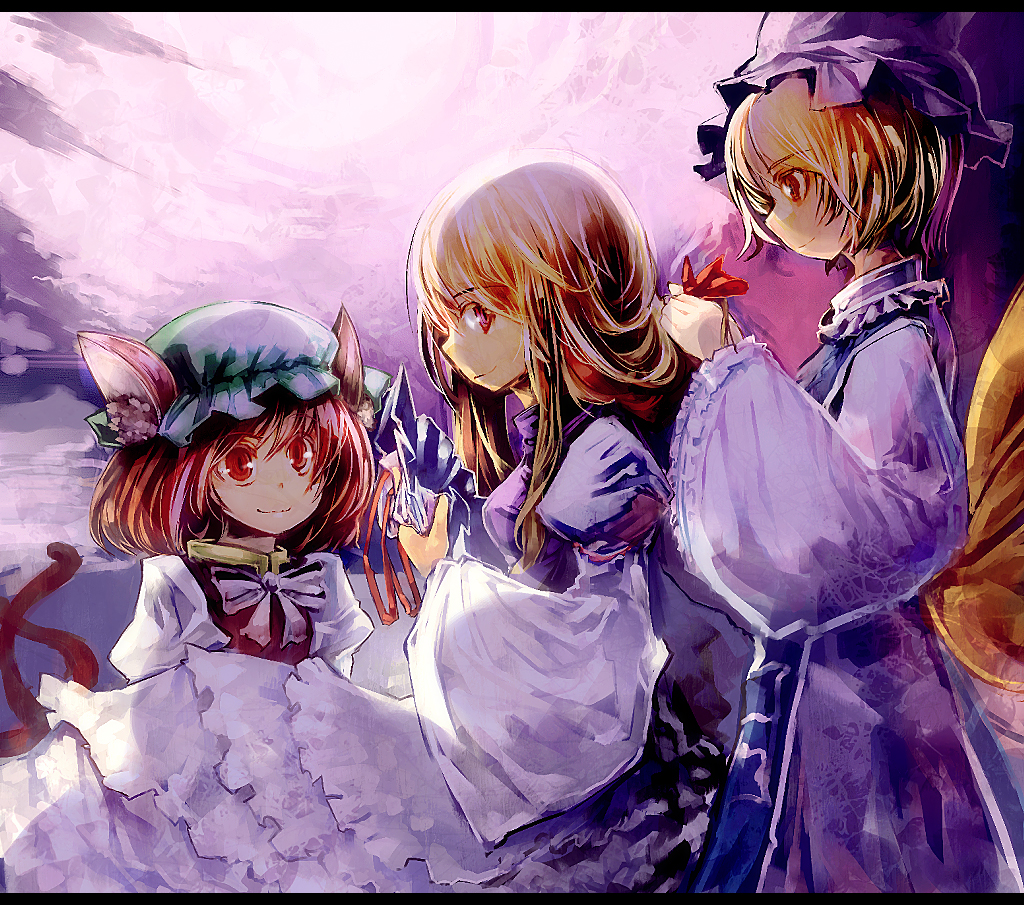 3girlsanimal earsblonde hairbowbrown haircat earscat girldressfemale focushairdressinghatlong hairmultiple girlsred eyestailunworn hatunworn headwearwide sleeves