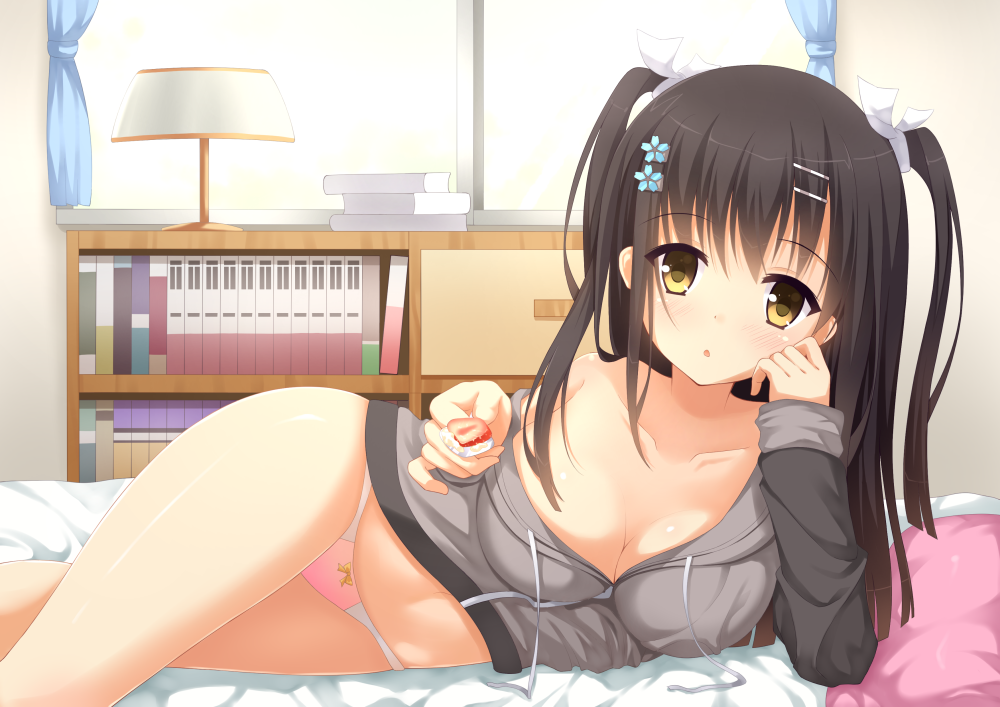 bedroomblack hairblushbreastschitoricleavagecollarbonefemaleFlag for Deletionfoodfruithair ornamenthair ribbonhaircliphairpinlong hairlooking at viewerlyingno pantsoff shoulderon bedon sideopen mouthpantiespov feedingribbonsolostrawberrytwo side upunderwearyellow eyes