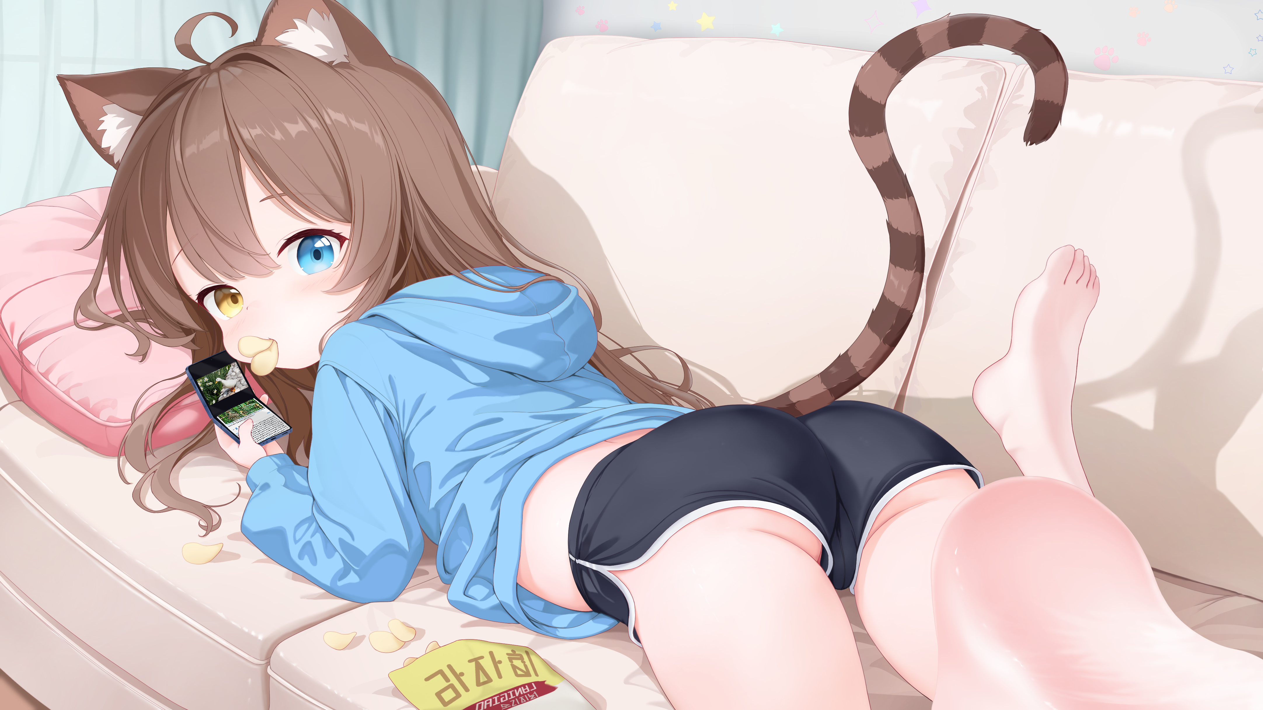 0sherbetcat1girlanimal earsassbag of chipsbarefootblack shortsblue eyesblue hoodiebrown haircat earscat girlcat tailcellphonechips (food)couchdolphin shortsfoodfood in mouthheterochromiahoodhood downhoodieindoorslong hairlong sleeveslooking at viewerlyingon couchon stomachphonepotato chipspringle duckshort shortsshortssmartphonetailyellow eyes