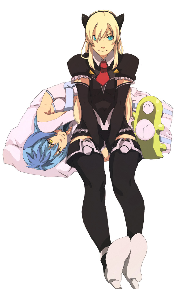 4k1030, cloud strife, moogle, tifa lockhart, final fantasy, final fantasy vii, final fantasy vii rebirth, final fantasy vii remake, absurdres, highres, 1girl, bare shoulders, black gloves, black hair, black skirt, black thighhighs, boots, buster sword, closed eyes, crop top, elbow gloves, facing another, fingerless gloves, full body, gloves, holding, holding sword, holding weapon, long hair, low-tied long hair, midriff, on lap, open mouth, red boots, seiza, sitting, skirt, suspender skirt, suspenders, sword, tank top, thighhighs, twitter username, weapon, white tank top