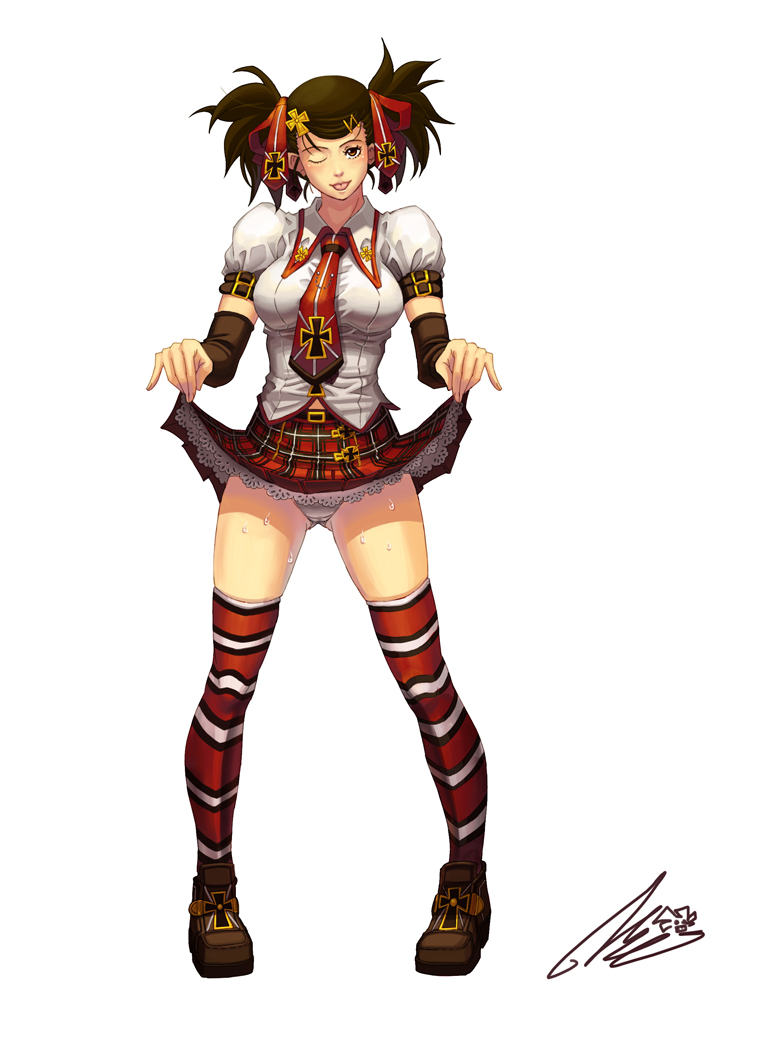 :p1girlarm warmersbeltbrown eyesbrown hairclothes liftcrossfemale focushair ornamentlacelegsnecktieone eye closedpantiespinky outplaid clothesplaid skirtschool uniformsimple backgroundskirtskirt liftsolostandingstriped clothesstriped thighhighssweatthighhighstonguetongue outtwintailsunderwearupskirtwhite pantieswink