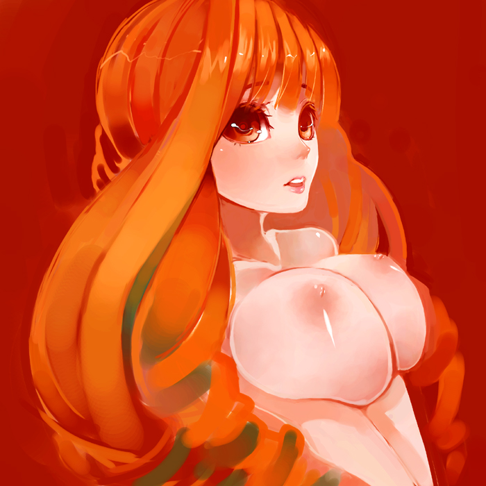 1girlbreastsbreasts squeezed togetherbrown eyesbrown hairdrill hairfemale focuslarge breastslipslong hairmatching hair/eyesnipplesorange eyesorange hairred hairsoloteethv arms