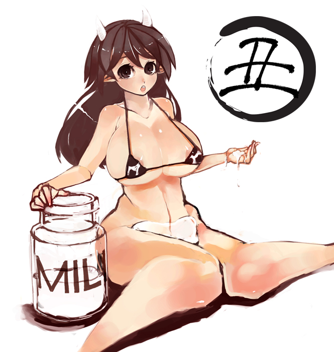 1girlanimal printbarefootbikinibreastsbrown eyesbrown hairchinese zodiaccleavagecow girlcow hornscow printfemale focuship focushornshuge breastsjarknees together feet apartlarge breastslong hairlooking at viewermicro bikinimilkmilk jugpointy earsshiny skinsimple backgroundsittingsoloswimsuitwakamezakewhite backgroundwide hips