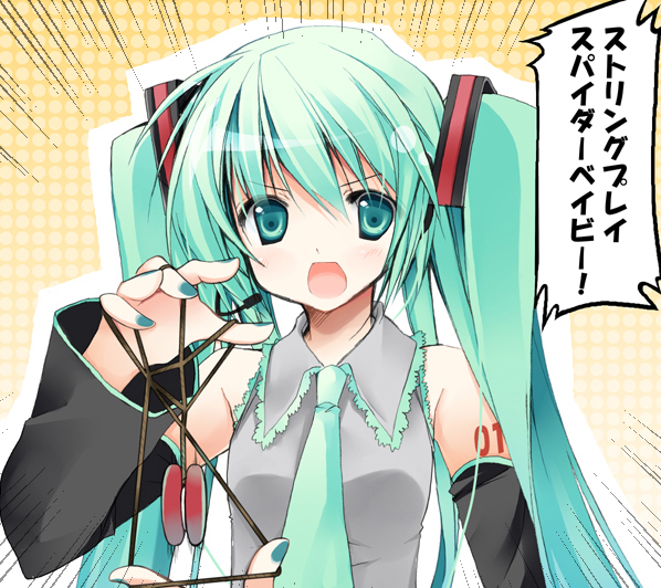 detached sleevesgreen eyesgreen hairmemenecktieopen mouthsolostring play spider baby (meme)twintailsyo-yo