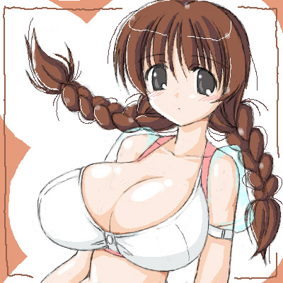 1girlbackpackbagblack eyesblushbraidbreastsbrown haircleavagefemale focushuge breastslong hairlooking at viewerrandoserusolotwin braidstwintailsupper body