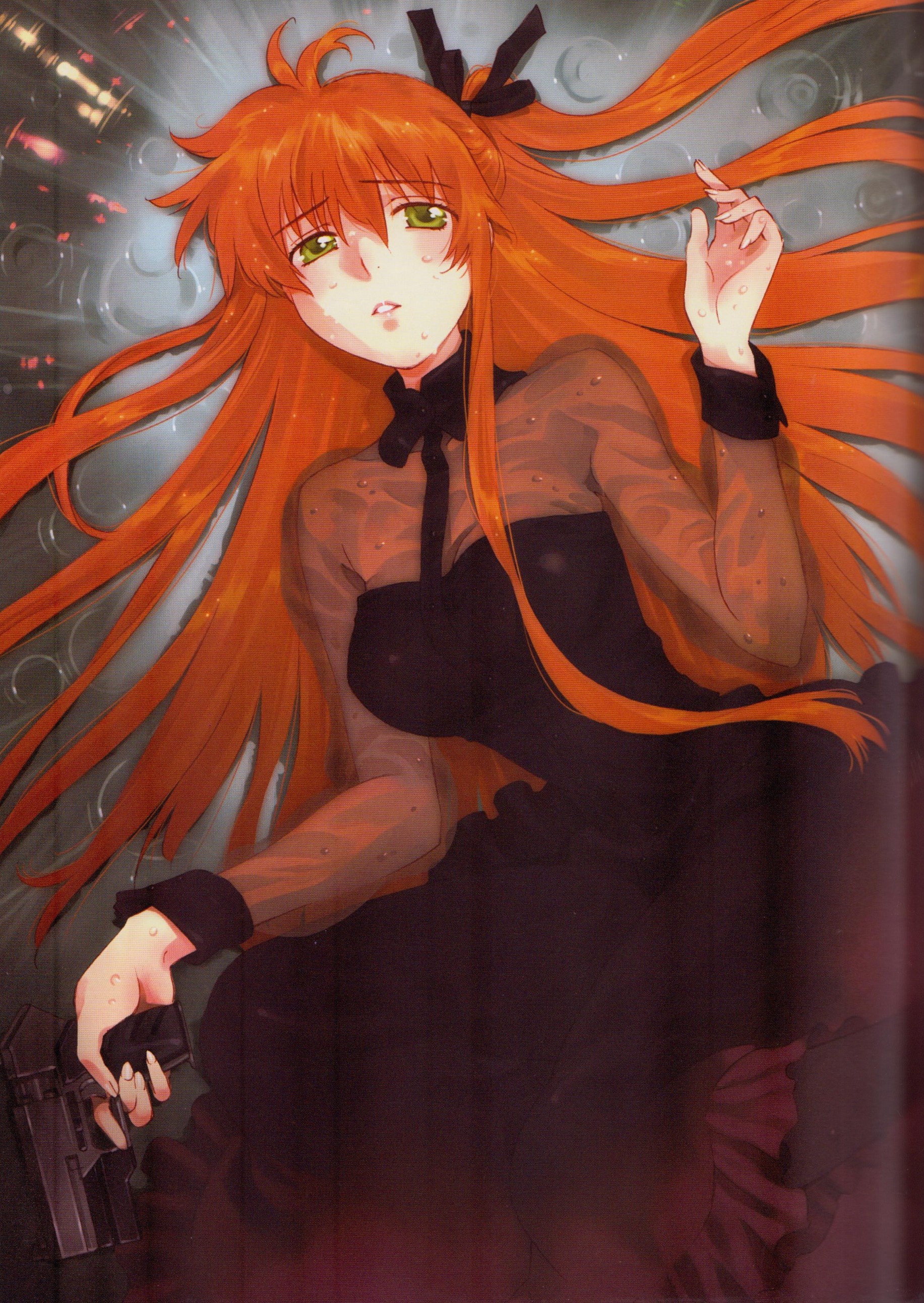 00s1girlbreastsdressfemale focusgothic lolitagreen eyesgunhair ribbonlolita fashionlong hairrainred hairribbonsoloweaponwet