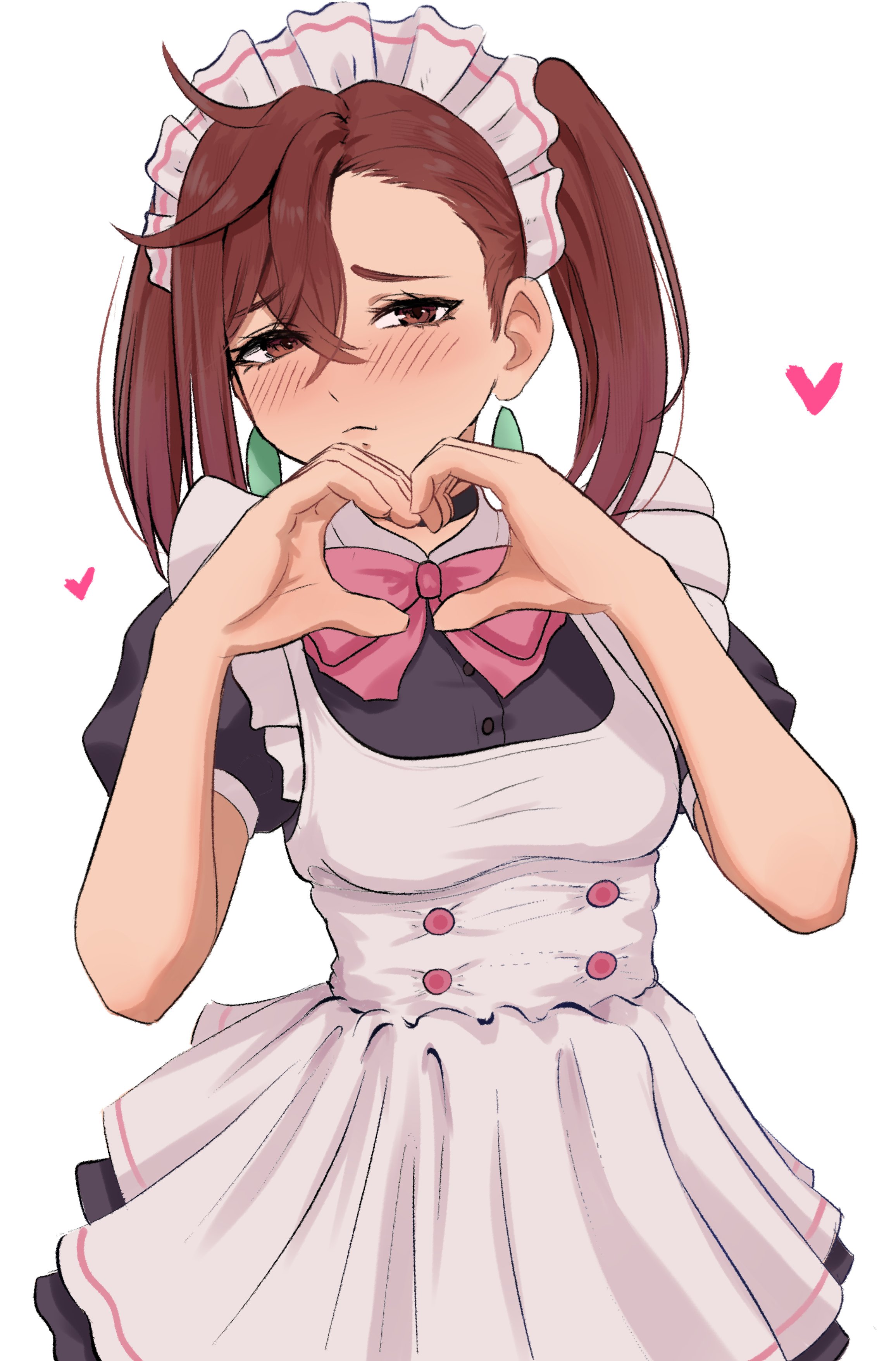 1girlalternate costumeapronblack chokerblack dressblushbowbowtiebrown hairchokerdressearringsenmaidedheartheart handsjewelrylooking at viewermaidmaid headdresspink bowpink bowtieshort sleevessimple backgroundsolotwintailswhite apronwhite background