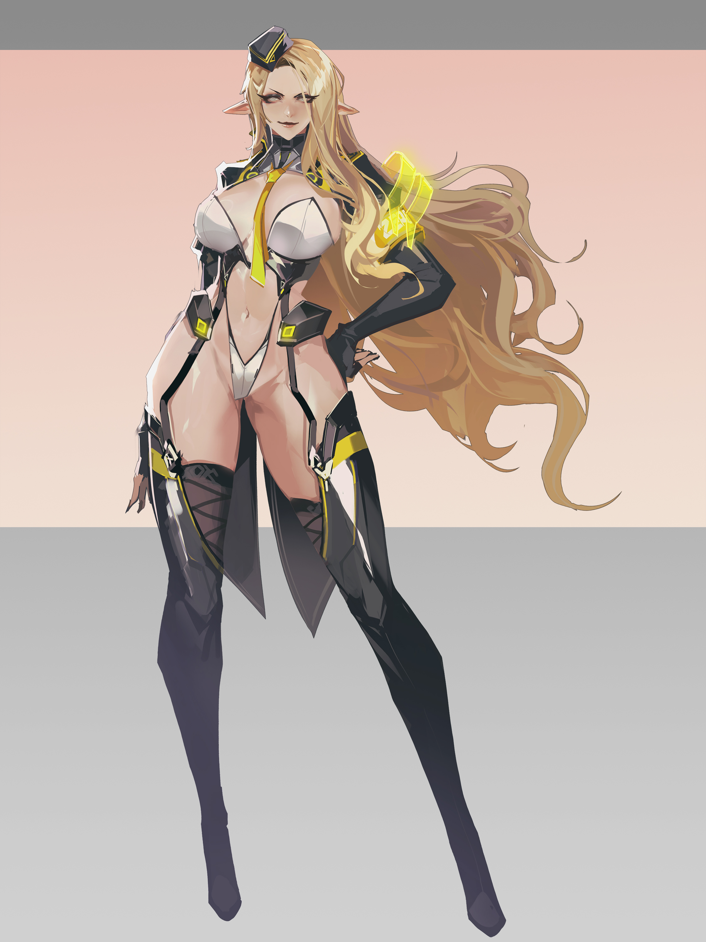 1girlbetween breastsblack bootsblack hatblack nailsblonde hairbootsbreastscontrappostoelffingerless glovesfull bodygloved sleevesgloveshand on own hiphatjuliet sleeveslarge breastslong hairlong sleeveslooking at viewernail polishnavelnecktienecktie between breastspointy earspuffy sleevessimple backgroundsolothigh bootstwo-tone backgroundvery long hairyellow eyesyellow necktie