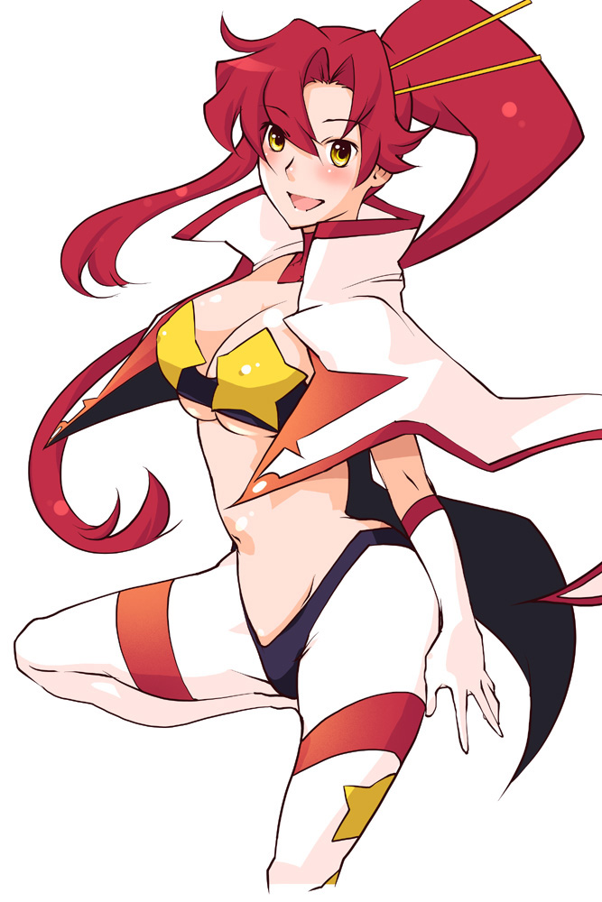 00s1girlblushbreastscleavagefemale focusgloveslarge breastsmidriffopen mouthponytailred hairsimple backgroundsoloyellow eyes