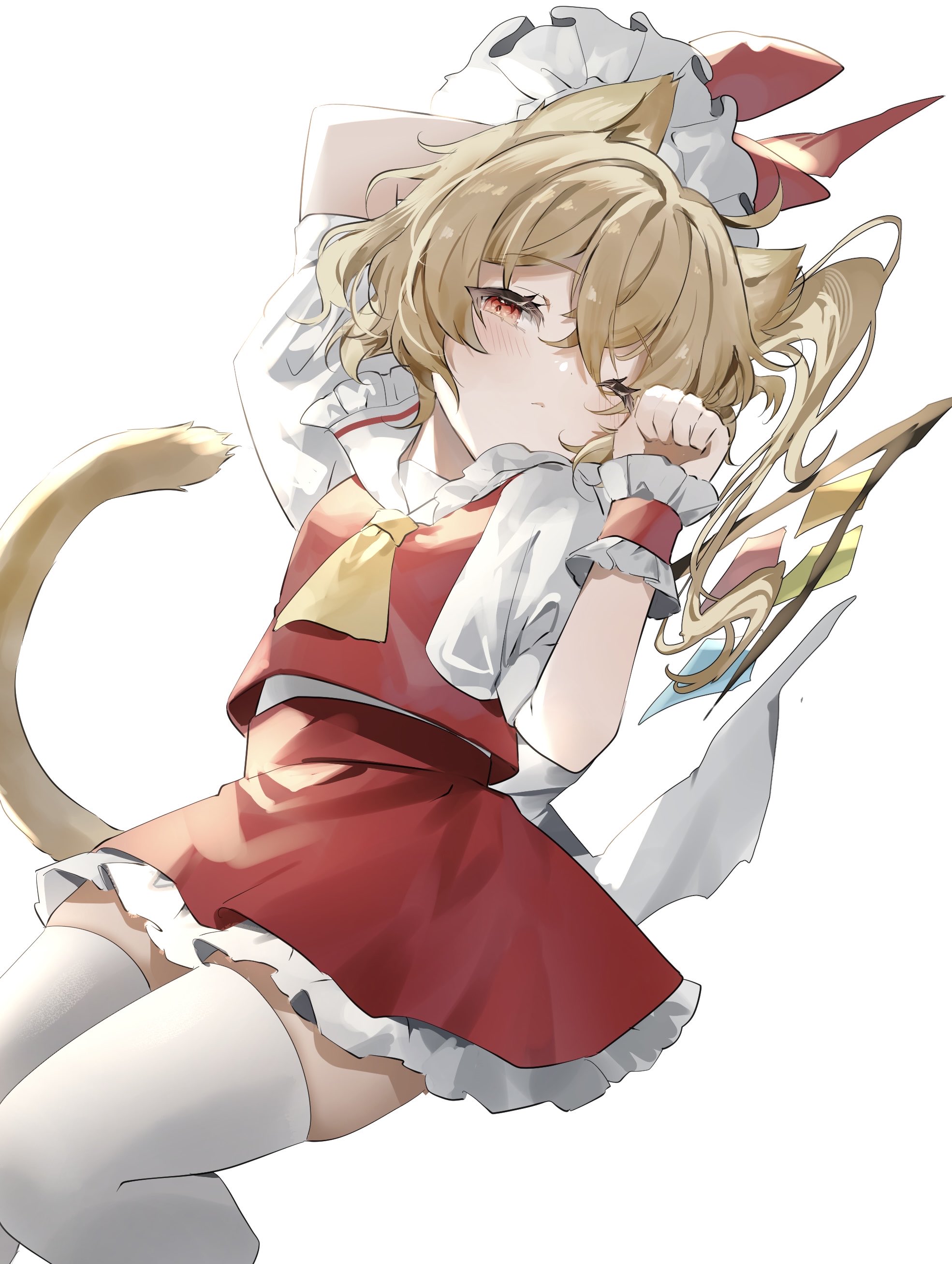 1girlanimal earsascotblonde haircat earscat girlcat tailcrystal wingsdutch anglefeet out of framefrilled skirtfrilled wrist cuffsfrillshatkemonomimi modelong hairlooking at viewerlyingmob capone eye closedone side uppaw posepuffy short sleevespuffy sleevesred eyesred skirtred vestshort sleevessimple backgroundskirtskirt setsolotailthighhighsvestwhite backgroundwhite thighhighswingswrist cuffsyellow ascot