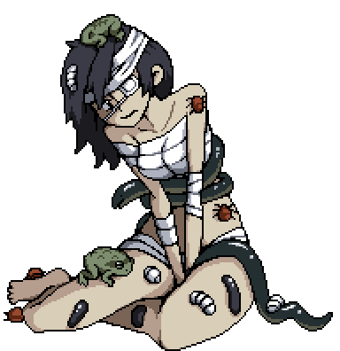 1girlarms between legsbandaged headbandagesblack hairbugchest sarashiclosed mouthcollarboneeeleyepatchfemale focusfrogfrog on headleechlong hairlooking at viewermaggotmedical eyepatchpixel artsarashisimple backgroundsittingsolotransparent backgroundyokozuwari