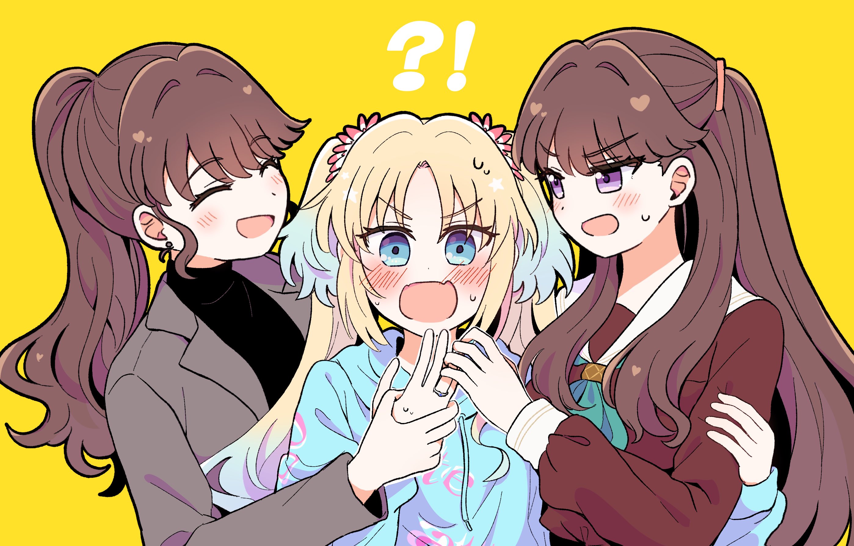 :d1boy3girlsaqua neckerchiefblack shirtblonde hairblue eyesblue hairblushbrown dressbrown hairclone haremclosed eyesclothes writingdressdual personafangfujishima megumi (post-graduation)girl sandwichgrabbing another's handgradient hairgrey jackethasu no sora school uniformheartjacketjewelrylong sleeveslooking at anothermulticolored hairmultiple girlsneckerchiefopen clothesopen mouthpurple eyesringsailor collarsailor dresssandwichedschool uniformsexy or cute?shirtsimple backgroundskin fangsmilestraight-ontime paradoxturtleneckturtleneck shirtupper bodyv-shaped eyebrowsvirtual youtuberwedding ringwhite sailor collarwinter uniformyellow backgroundyuri